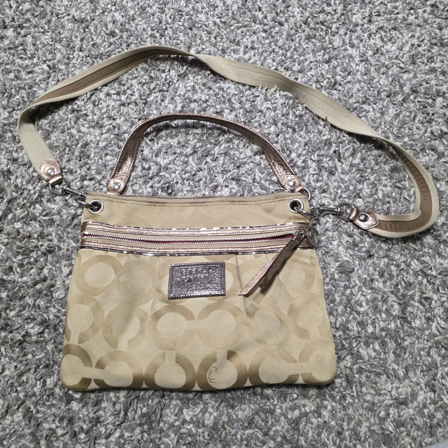 This is a Coach monogram crossbody bag. It's a tan colour with the signature C pattern. Includes a fabric strap and a decorative front plaque. Perfect for everyday use!