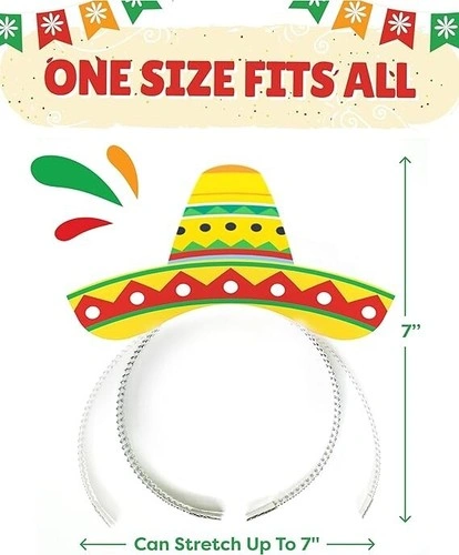 Set of 9 mini sombrero party hat headbands. Great for Cinco de Mayo, fiestas, and Mexican-themed parties with friends and family. Features 3 unique designs for fun photos and memories. The new 2024 anti-flop design prevents hats from falling. Double-sided printing ensures they look good from all angles. Hats measure about 7"x7" stretched and fit most heads with an expandable foil headband. Create a fun and happy atmosphere!