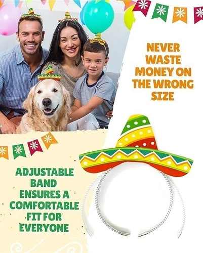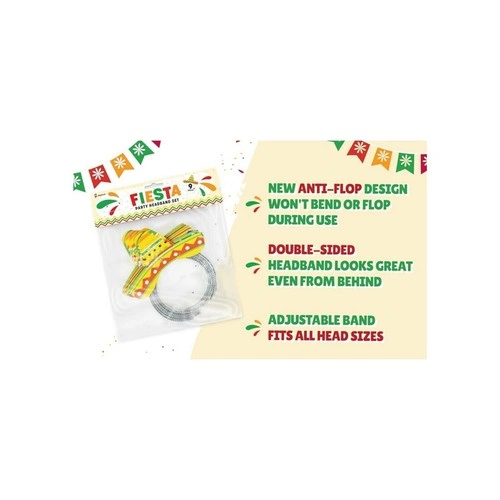 Set of 9 mini sombrero party hat headbands. Great for Cinco de Mayo, fiestas, and Mexican-themed parties with friends and family. Features 3 unique designs for fun photos and memories. The new 2024 anti-flop design prevents hats from falling. Double-sided printing ensures they look good from all angles. Hats measure about 7"x7" stretched and fit most heads with an expandable foil headband. Create a fun and happy atmosphere!