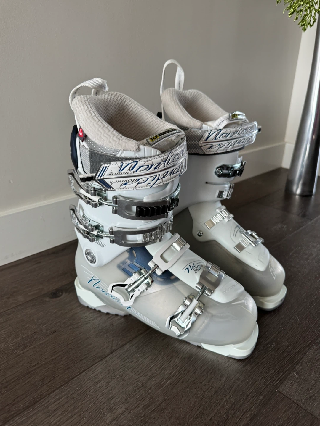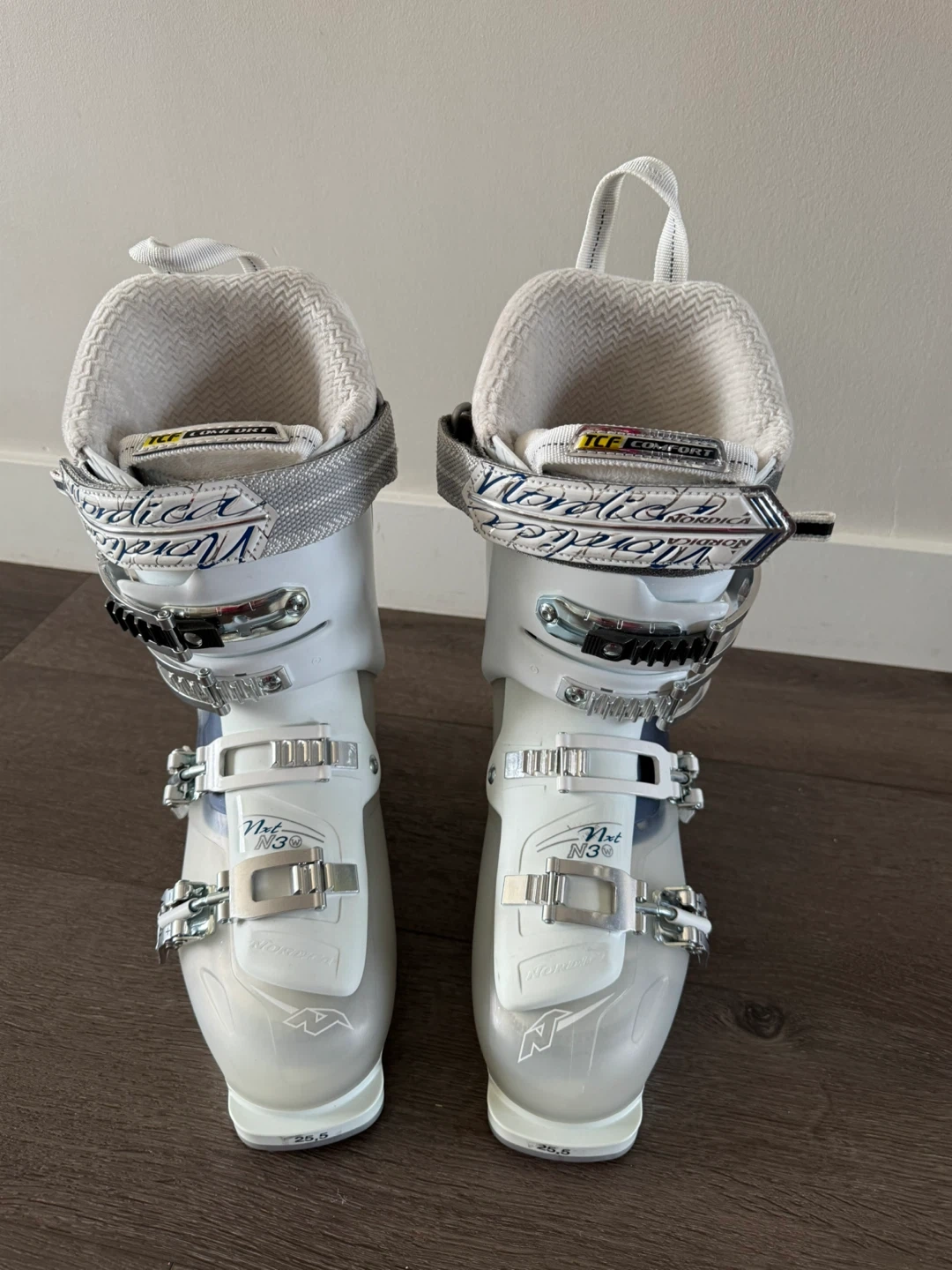 White Nordica ski boots with a comfortable ICE COMFORT liner. They're a size 25.5 with a flex rating of 85. Multiple buckles for a secure fit.
