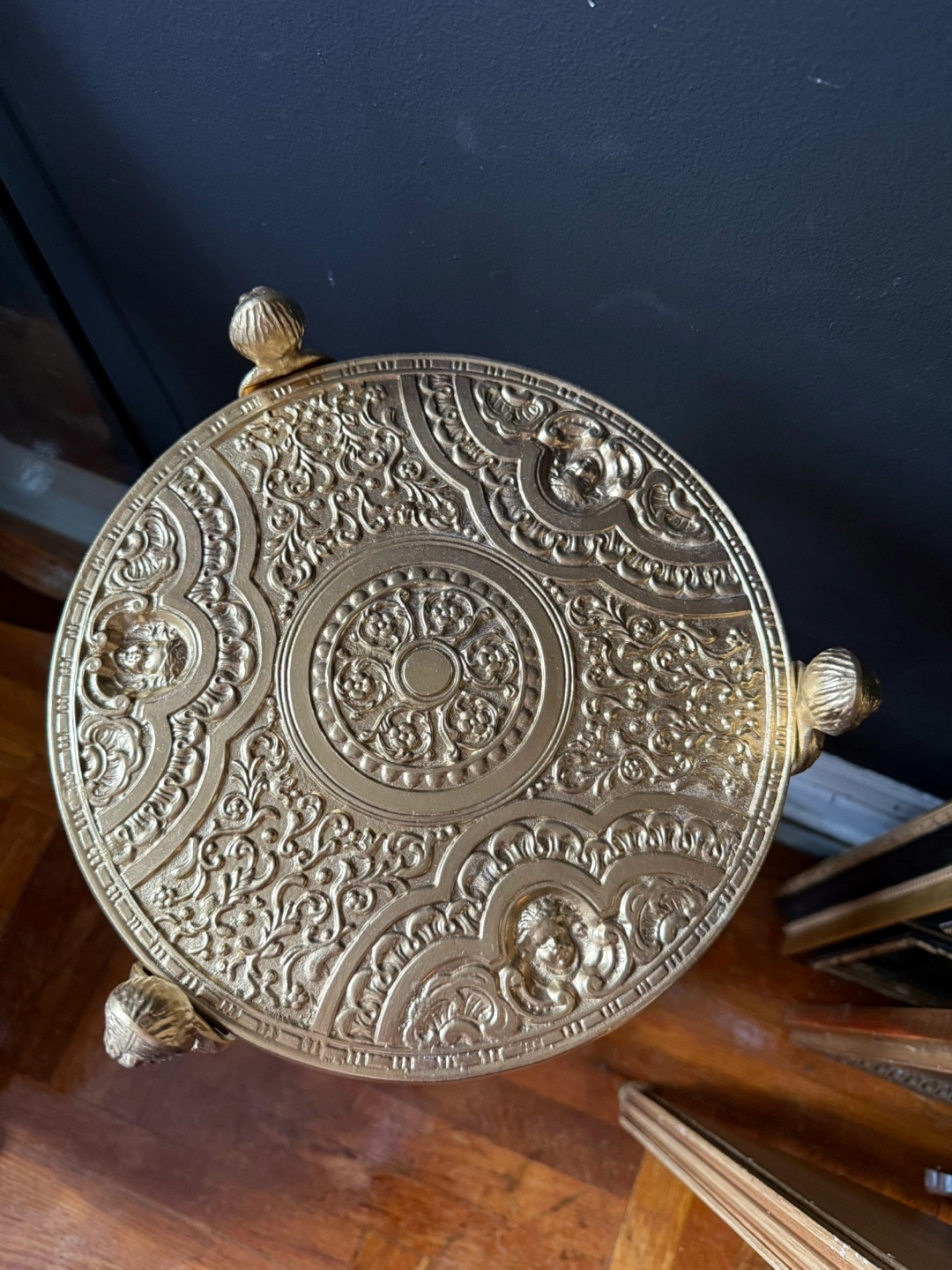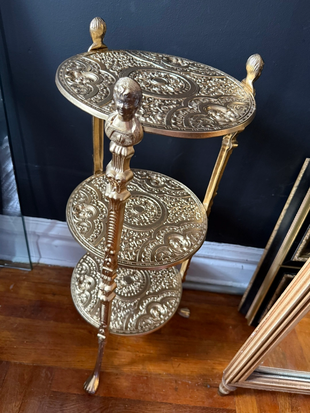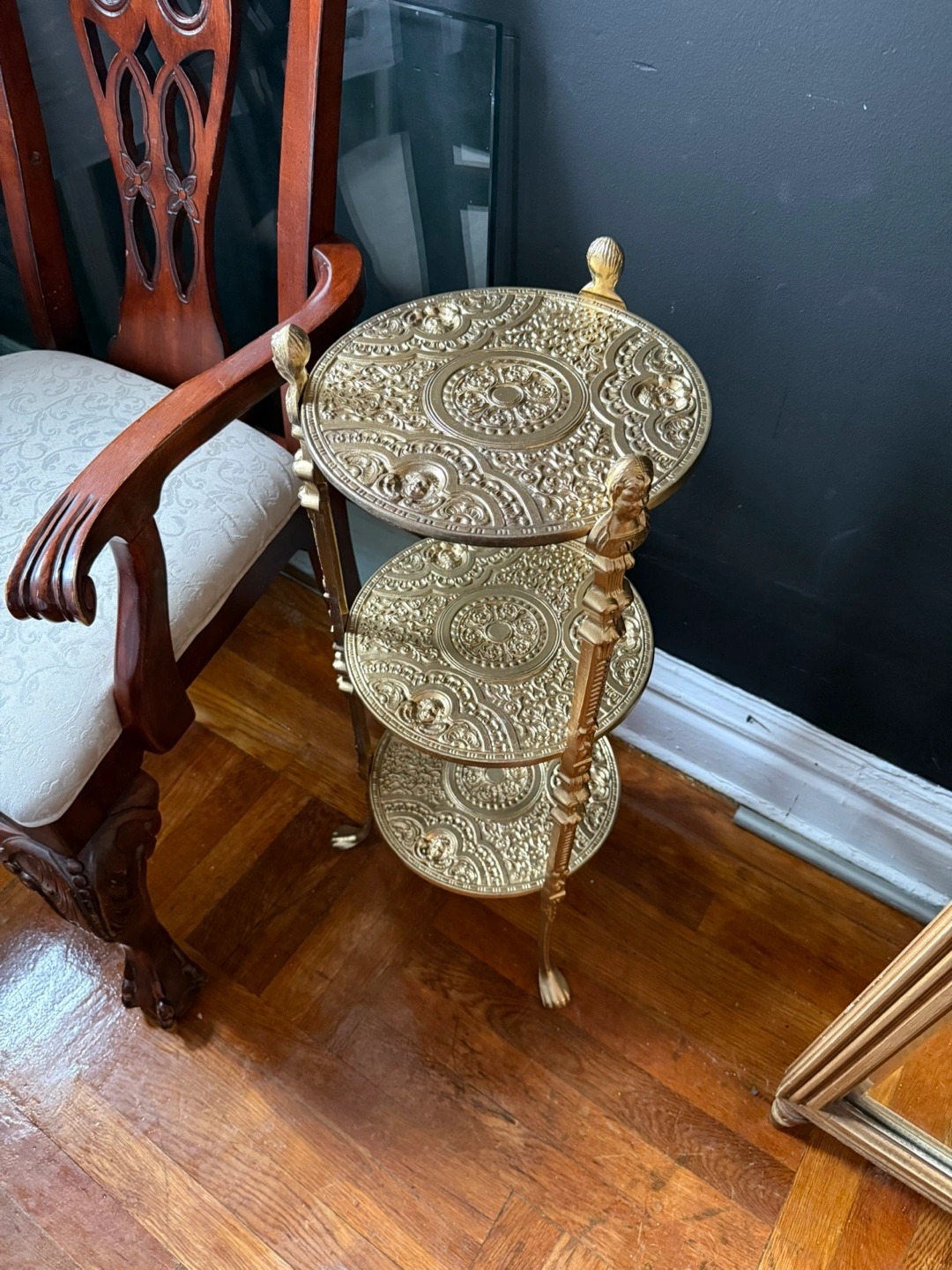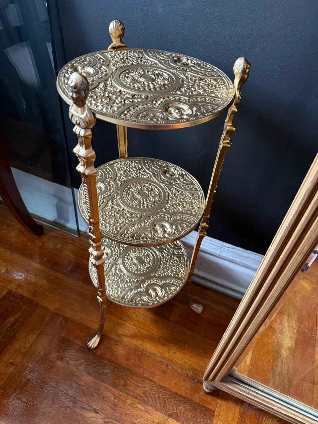 Vintage gold plant stand. Three tiers with ornate detailing. Features lion paw feet and decorative top finials. Perfect accent piece. Good conditions