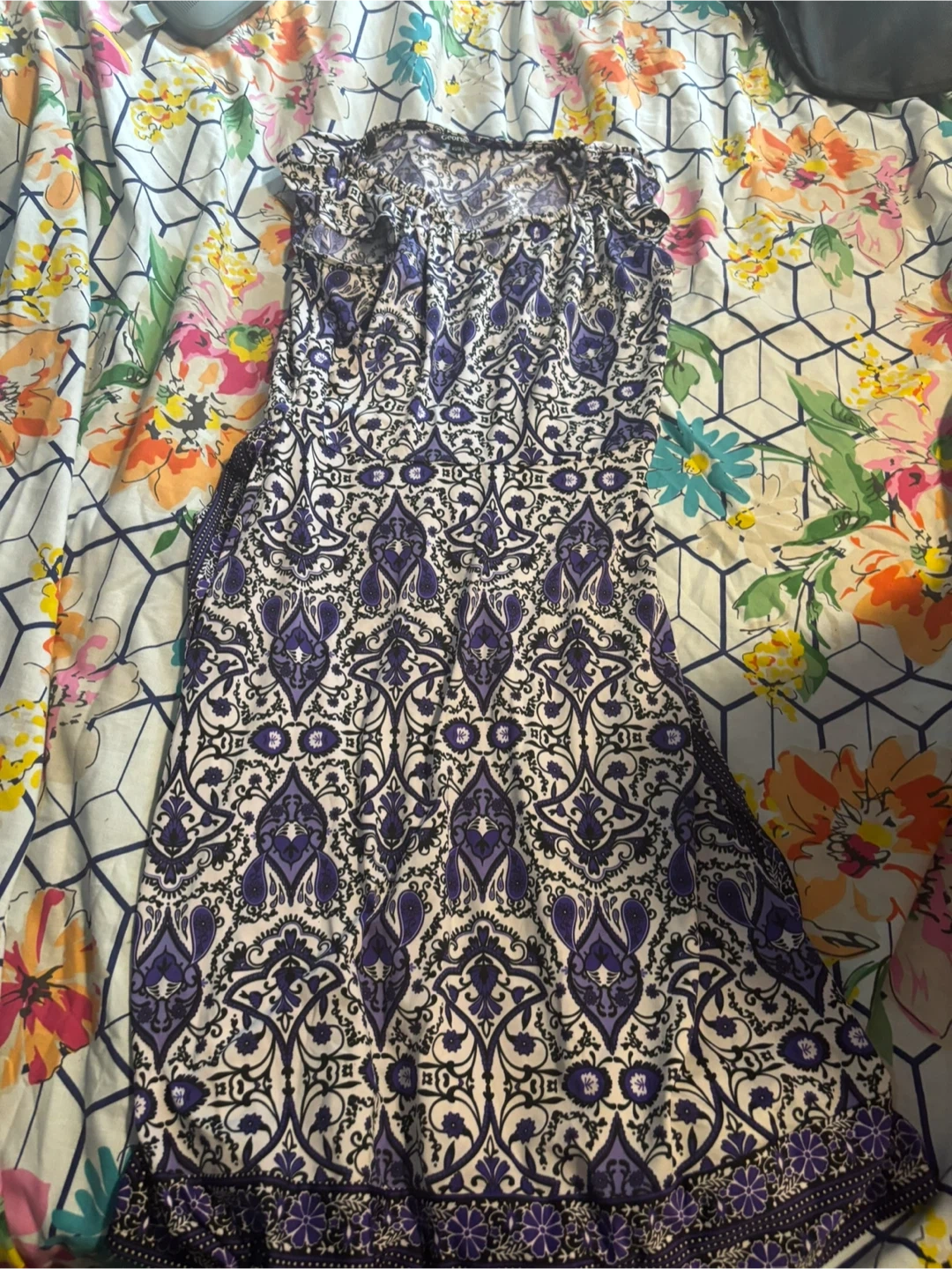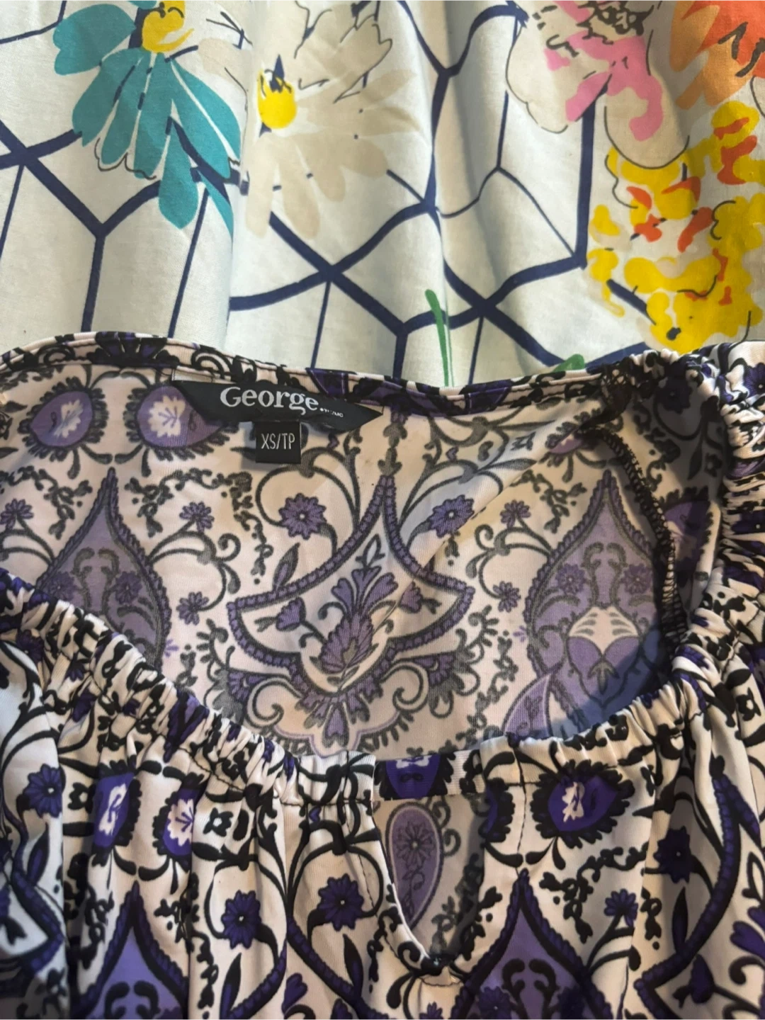 Here's a cute George brand dress in size XS/TP! It features a lovely purple and white pattern, perfect for a sunny day or casual outing