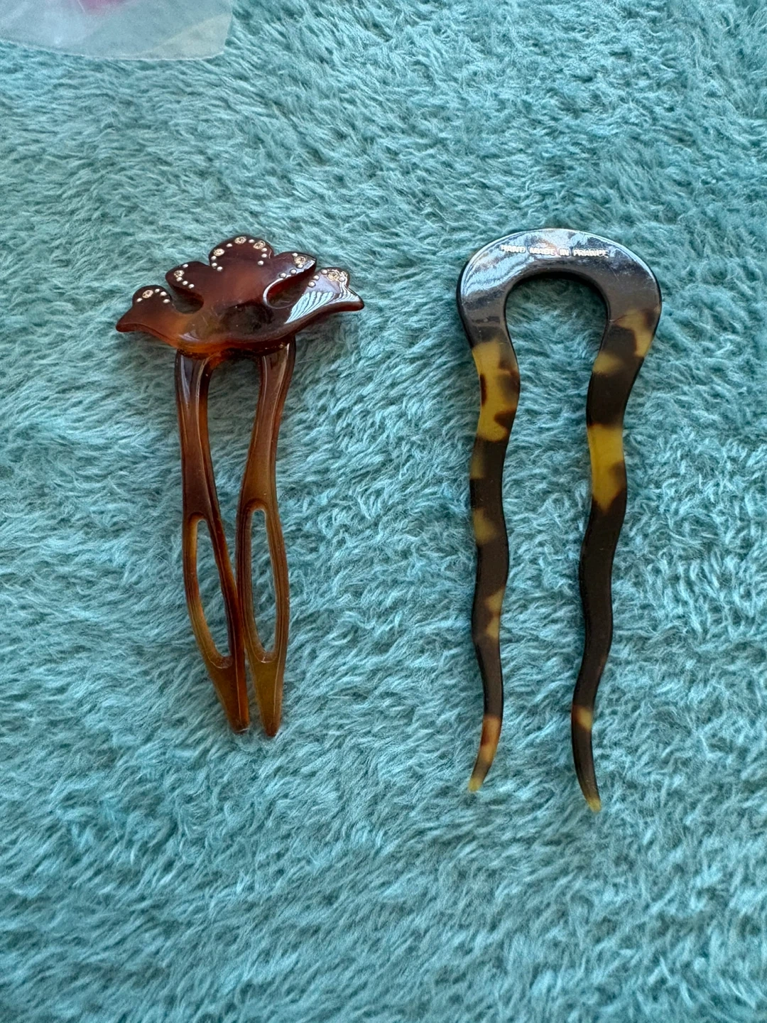 Two beautiful hair forks, hand made in France! One is a lovely tortoise shell colour with a simple design, and the other is a brown colour with a flower design and some rhinestones
