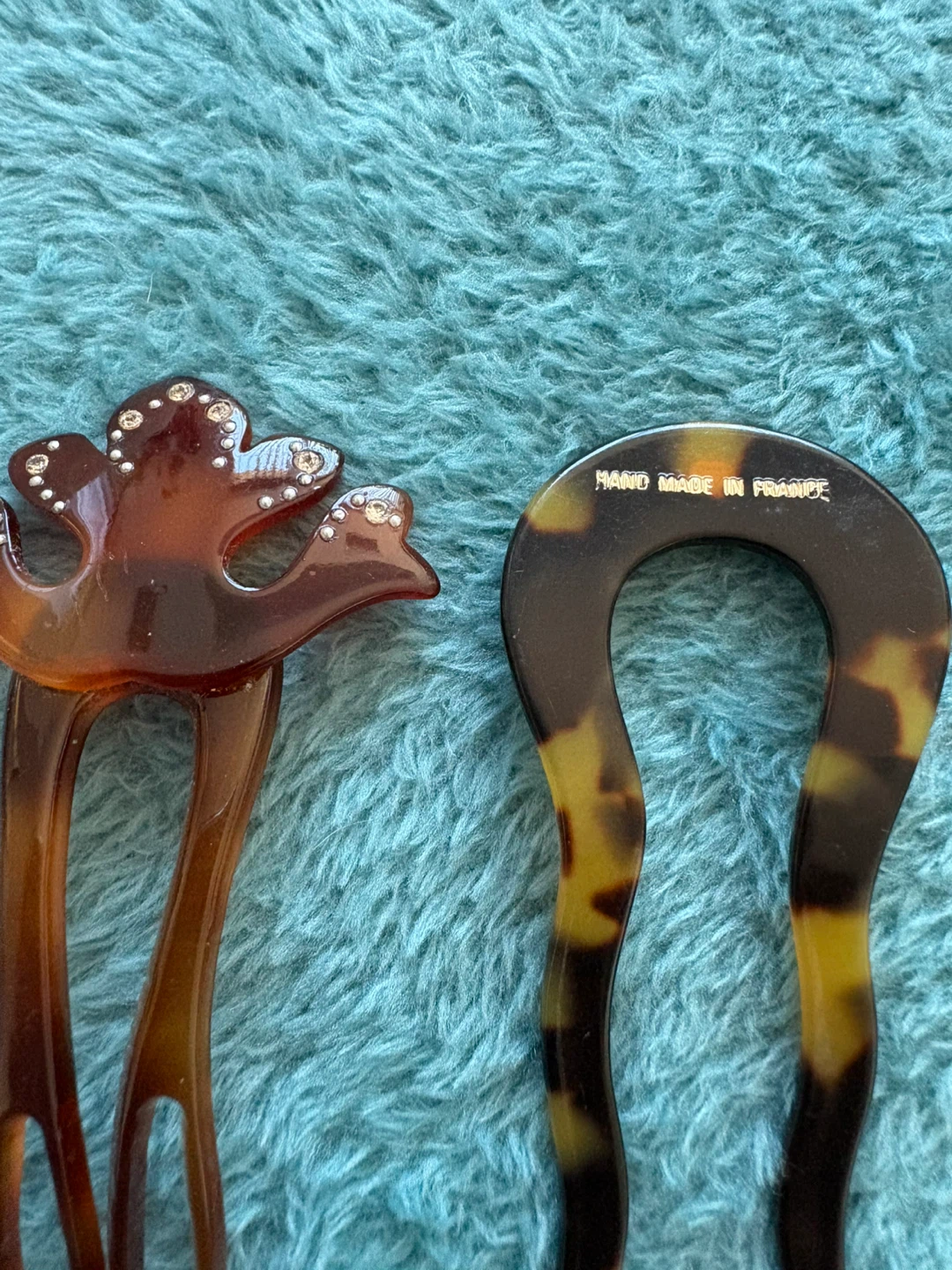 Two beautiful hair forks, hand made in France! One is a lovely tortoise shell colour with a simple design, and the other is a brown colour with a flower design and some rhinestones