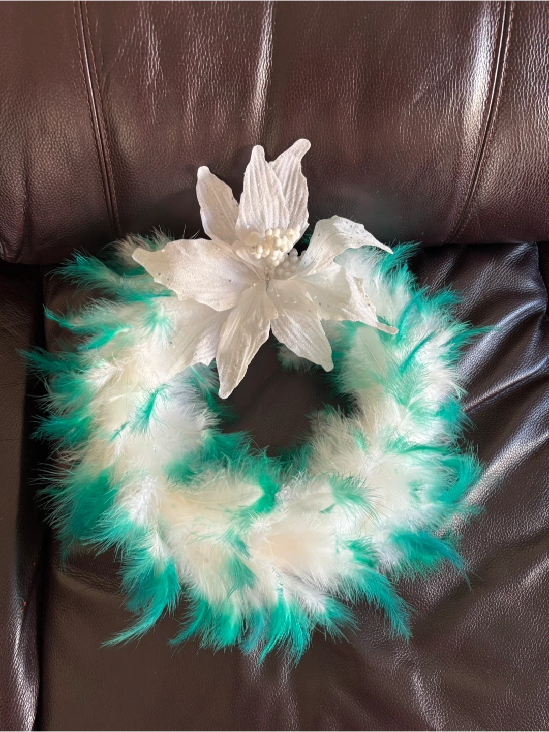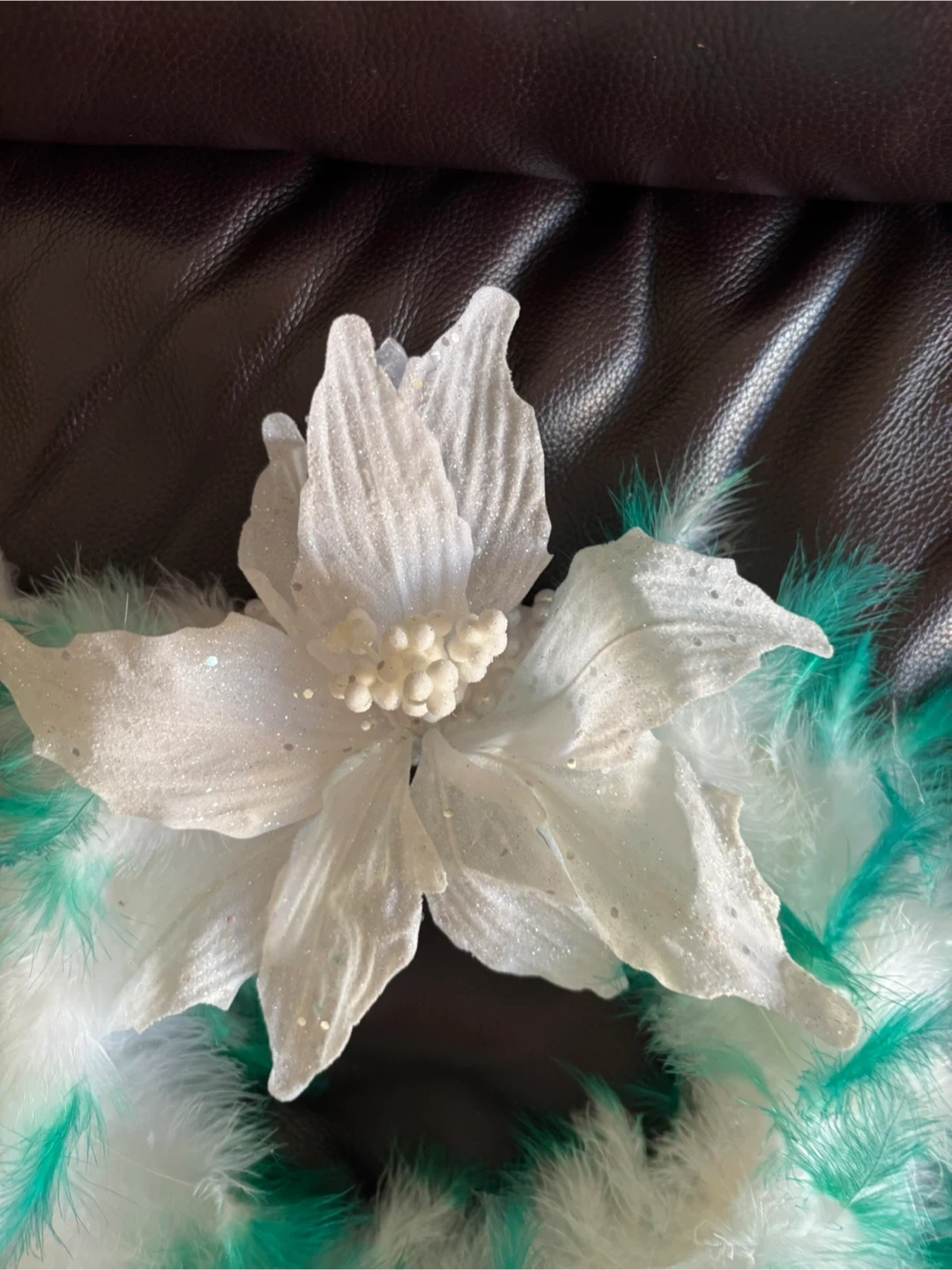 features a beautiful white poinsettia and a mix of green and white feathers. Perfect for decorating your door or walls during the holidays or any time of year.