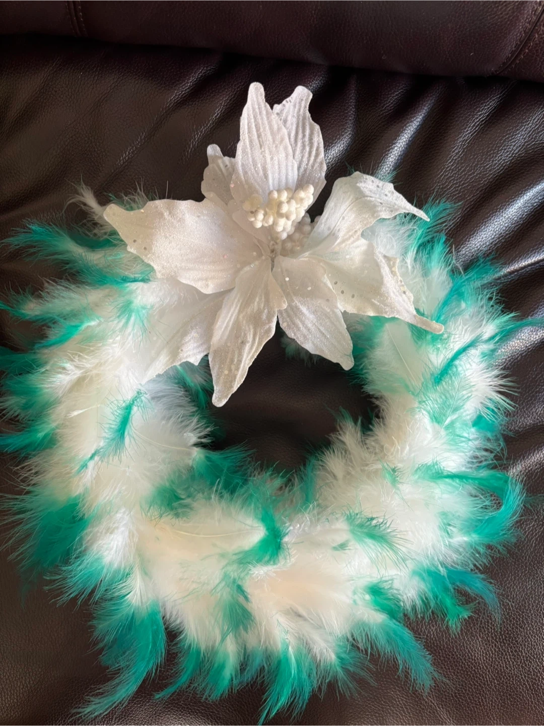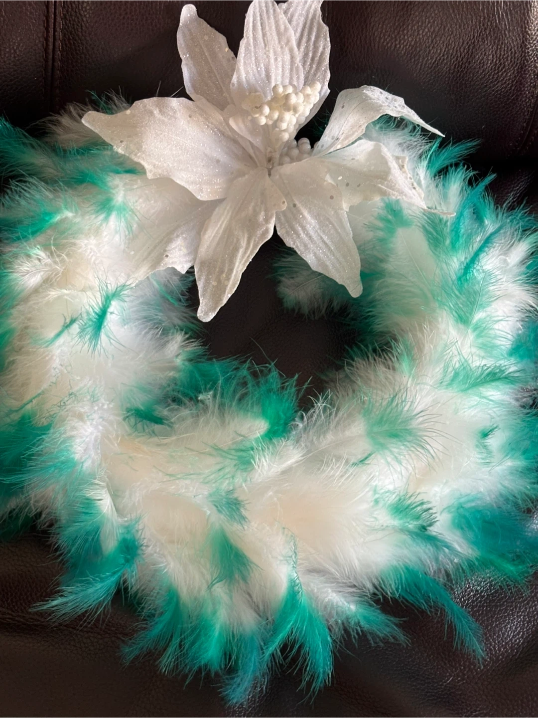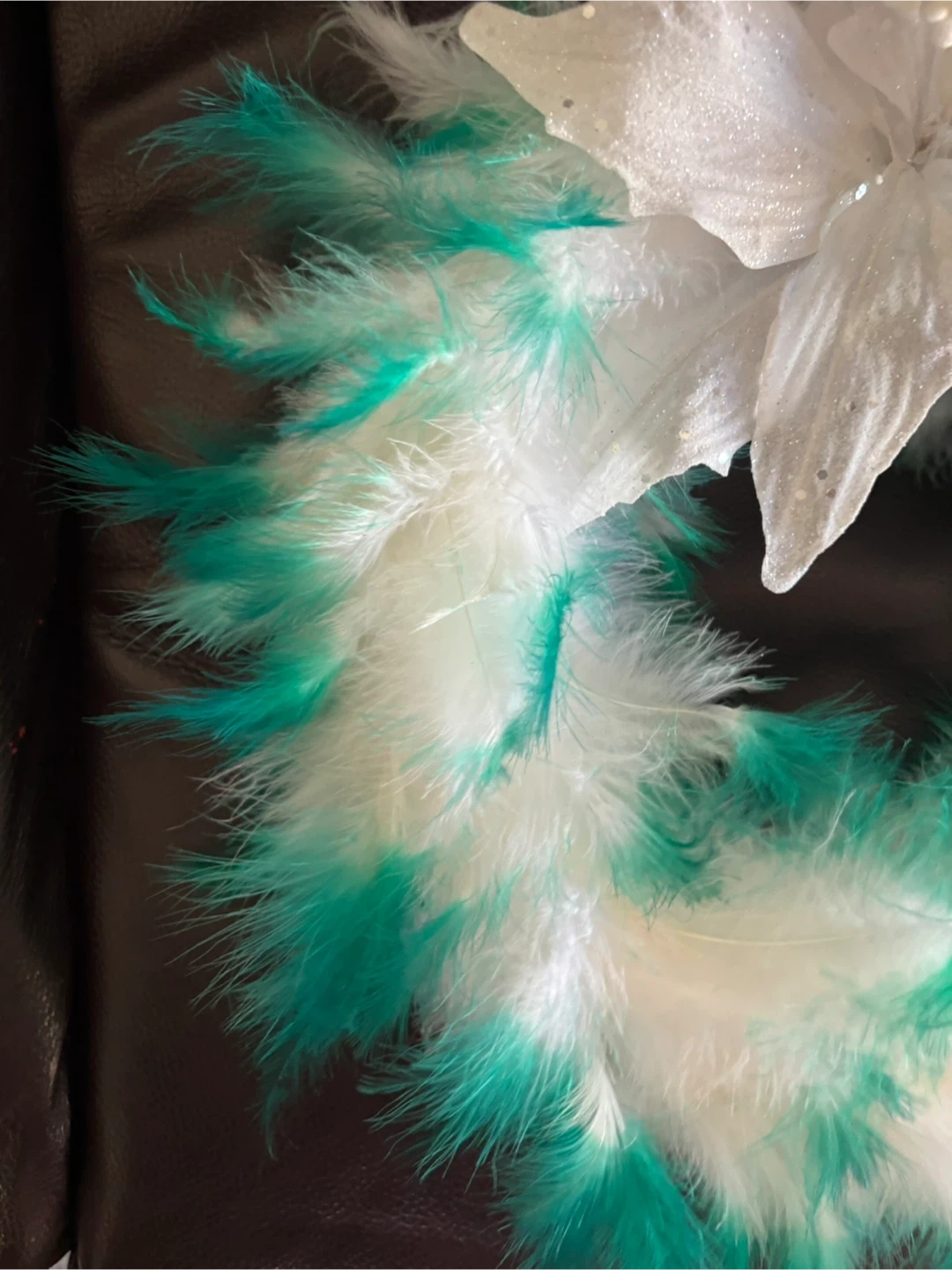 features a beautiful white poinsettia and a mix of green and white feathers. Perfect for decorating your door or walls during the holidays or any time of year.