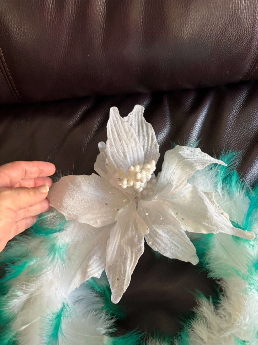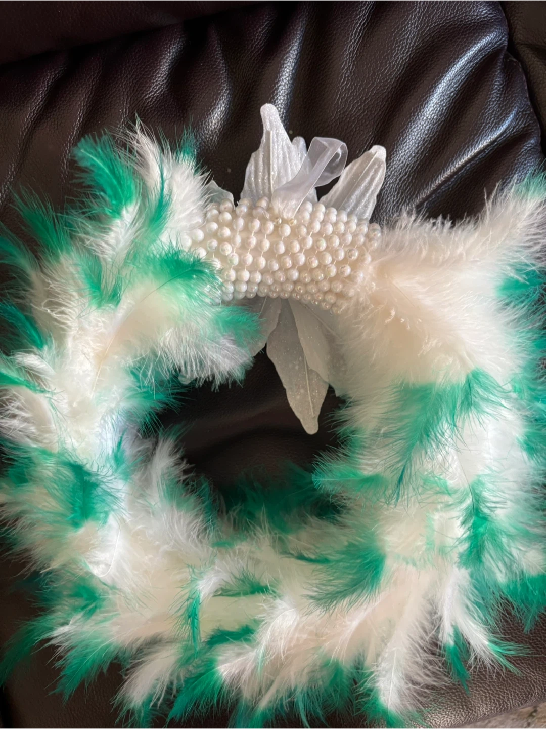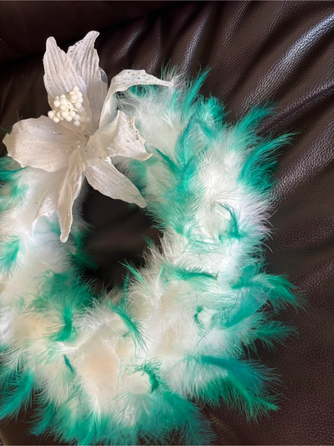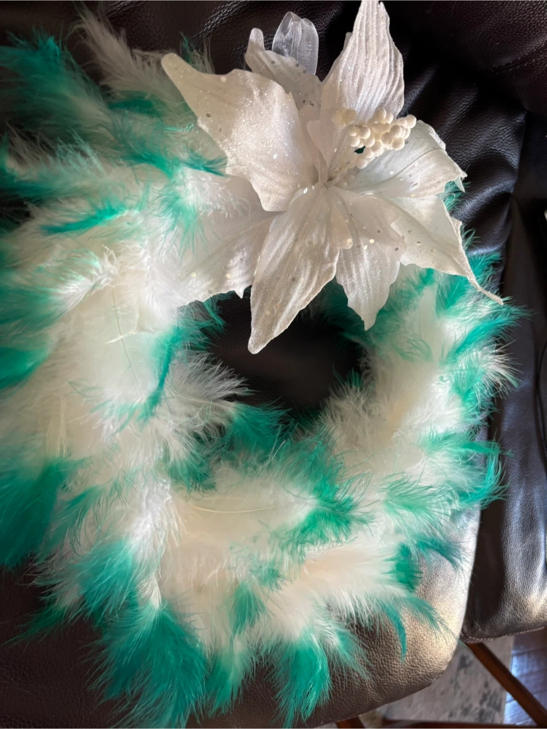 features a beautiful white poinsettia and a mix of green and white feathers. Perfect for decorating your door or walls during the holidays or any time of year.