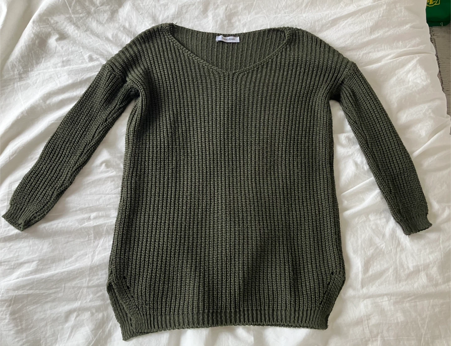 Cozy olive green sweater. Has a V-neck and chunky knit. Made in Italy. No size on tag but fits S-M.