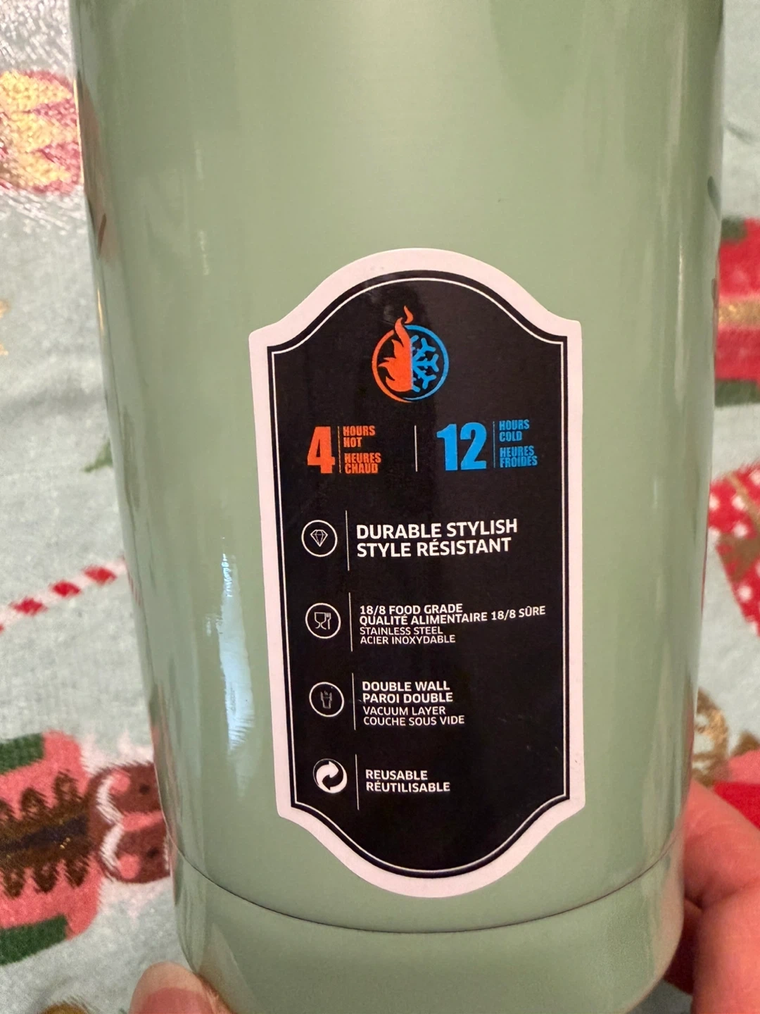 It's double-walled stainless steel and keeps drinks cold for 12 hours or hot for 4 hours. Great for all seasons.