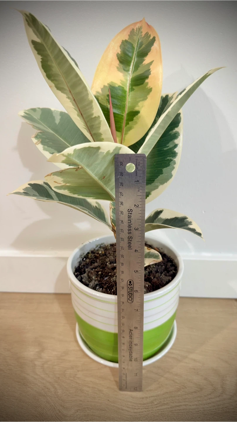 This beautiful Ficus Elastica plant boasts stunning variegated leaves with shades of green, cream, and yellow. It's potted in a decorative ceramic planter with a bright green stripe. This plant adds a pop of colour to any indoor space! Approximately 8 inches tall.