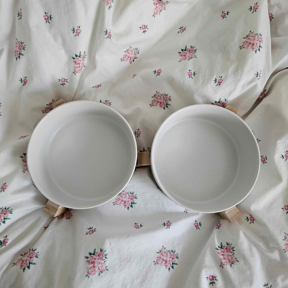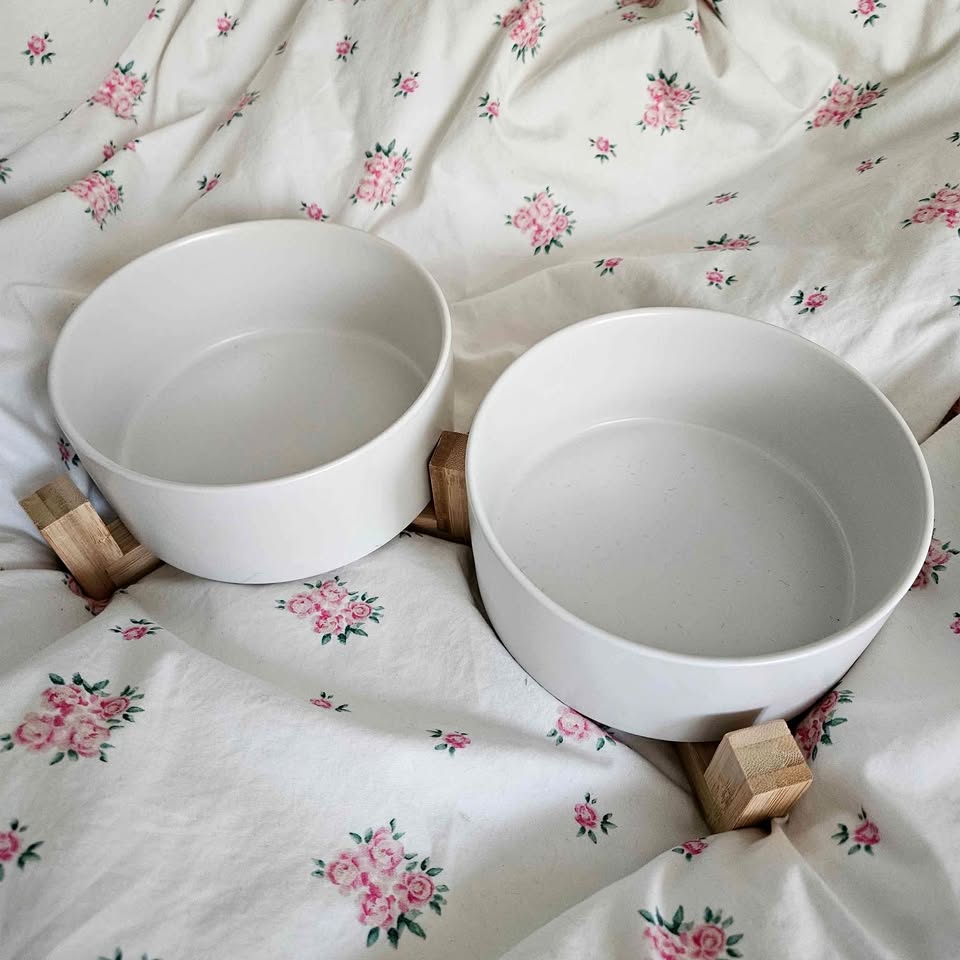 Ceramic Pet Bowls with Wooden Stand in White Used-good condition, minor flaws of utensil scratches. Easy to clean Wooden stand for stability Food-grade safe Microwave oven safe Suitable for small pets, cats, and small dogs Care: Hand wash or dishwasher. Message me for meet up or drop off within Vancouver. Thanks!