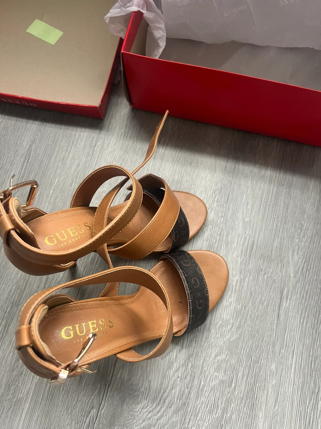 These are stylish brown Guess heeled sandals with a signature logo detail on the strap. They come with the original box and are ready for your next outing! Heel height is approximately 4 inches.