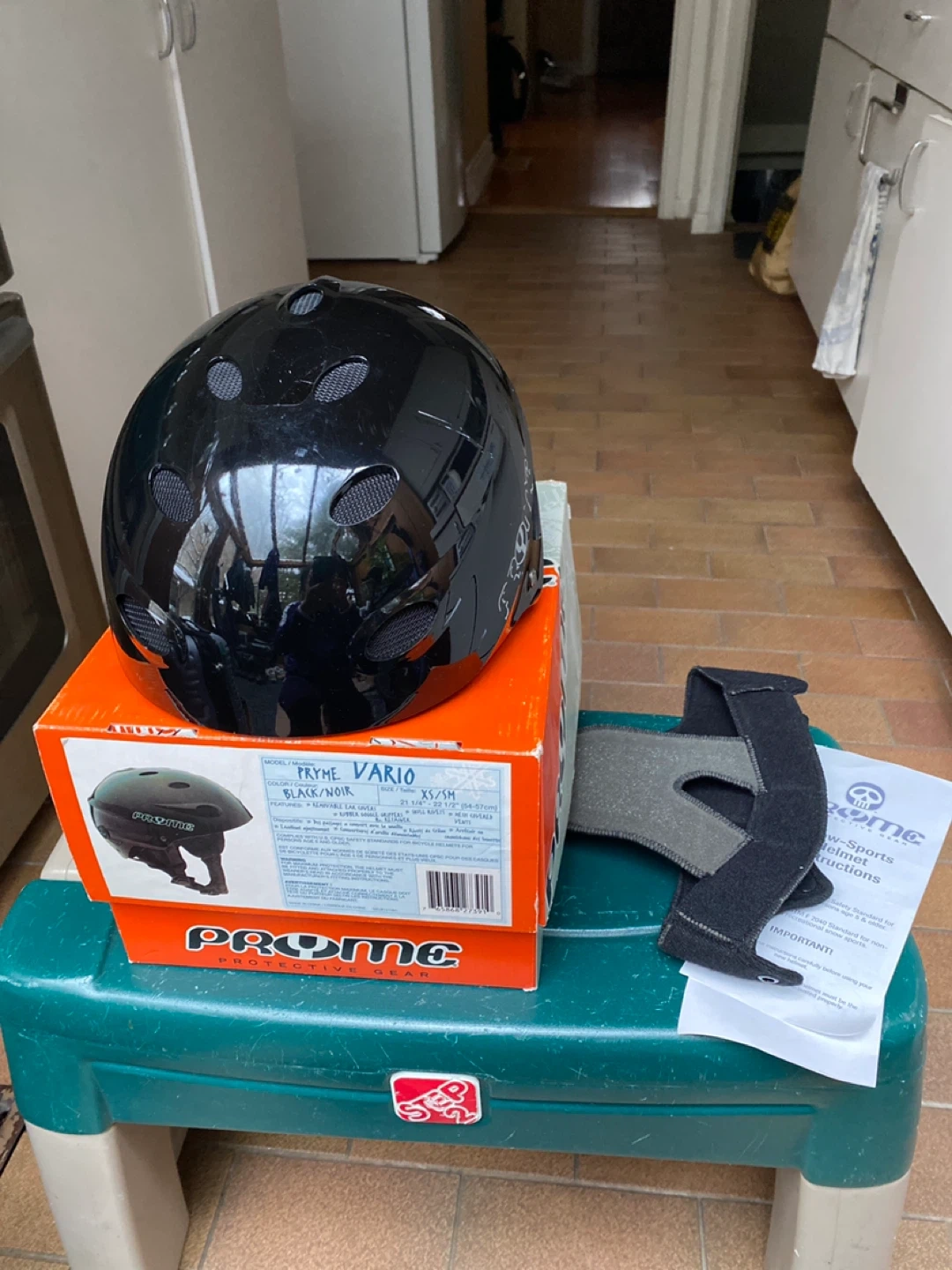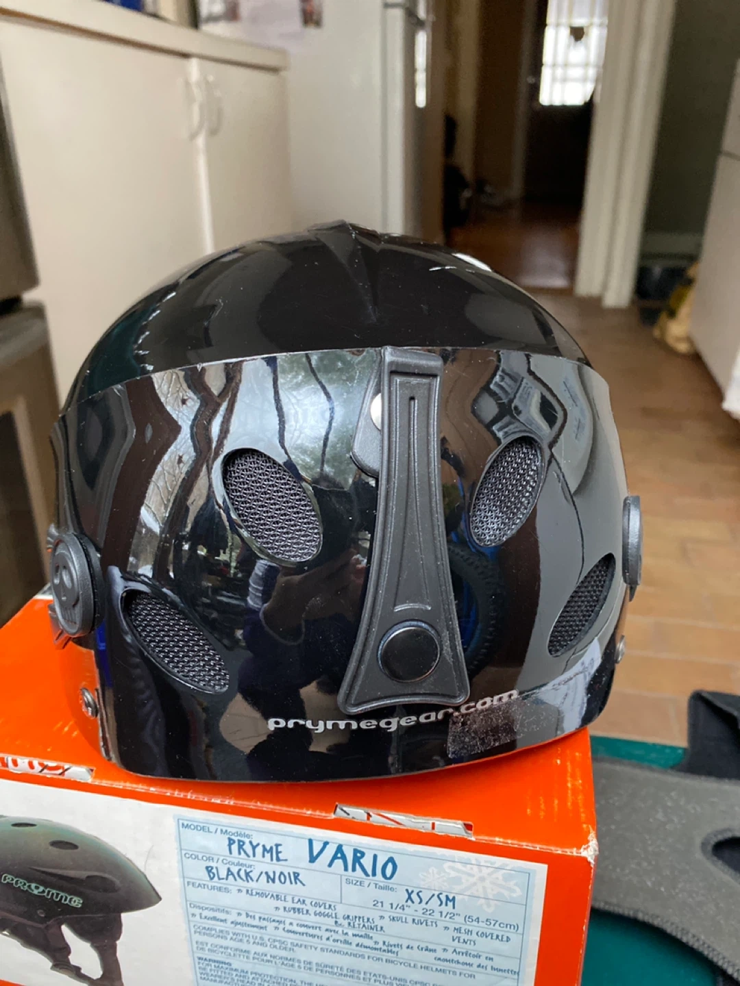 This is a Pryme Vario helmet in black. It's a size XS/SM, fitting 54-57cm (for child around 5-12 yrs). It has ear covers and rubber goggle grippers. Excellent condition, still comes with original box.