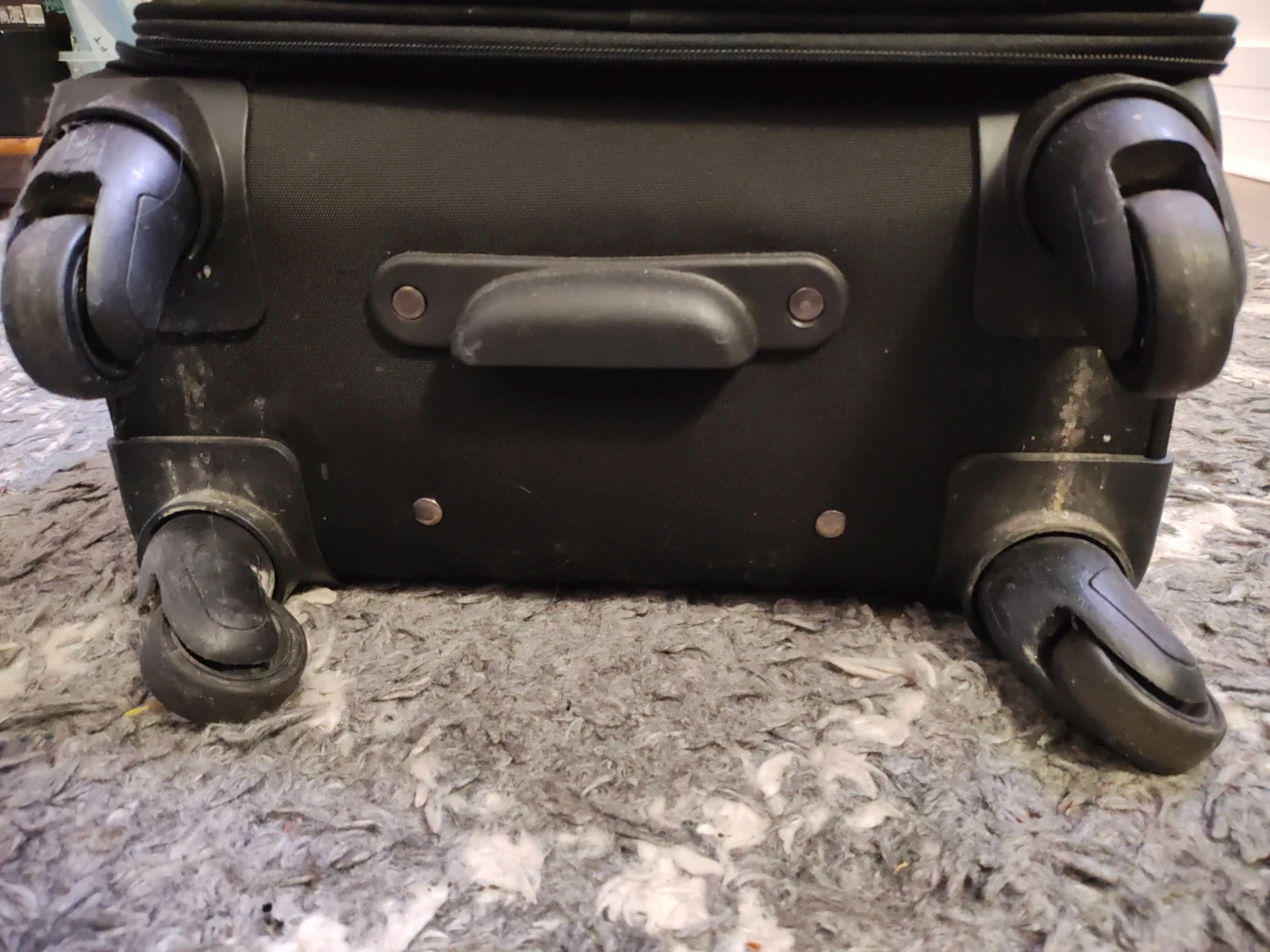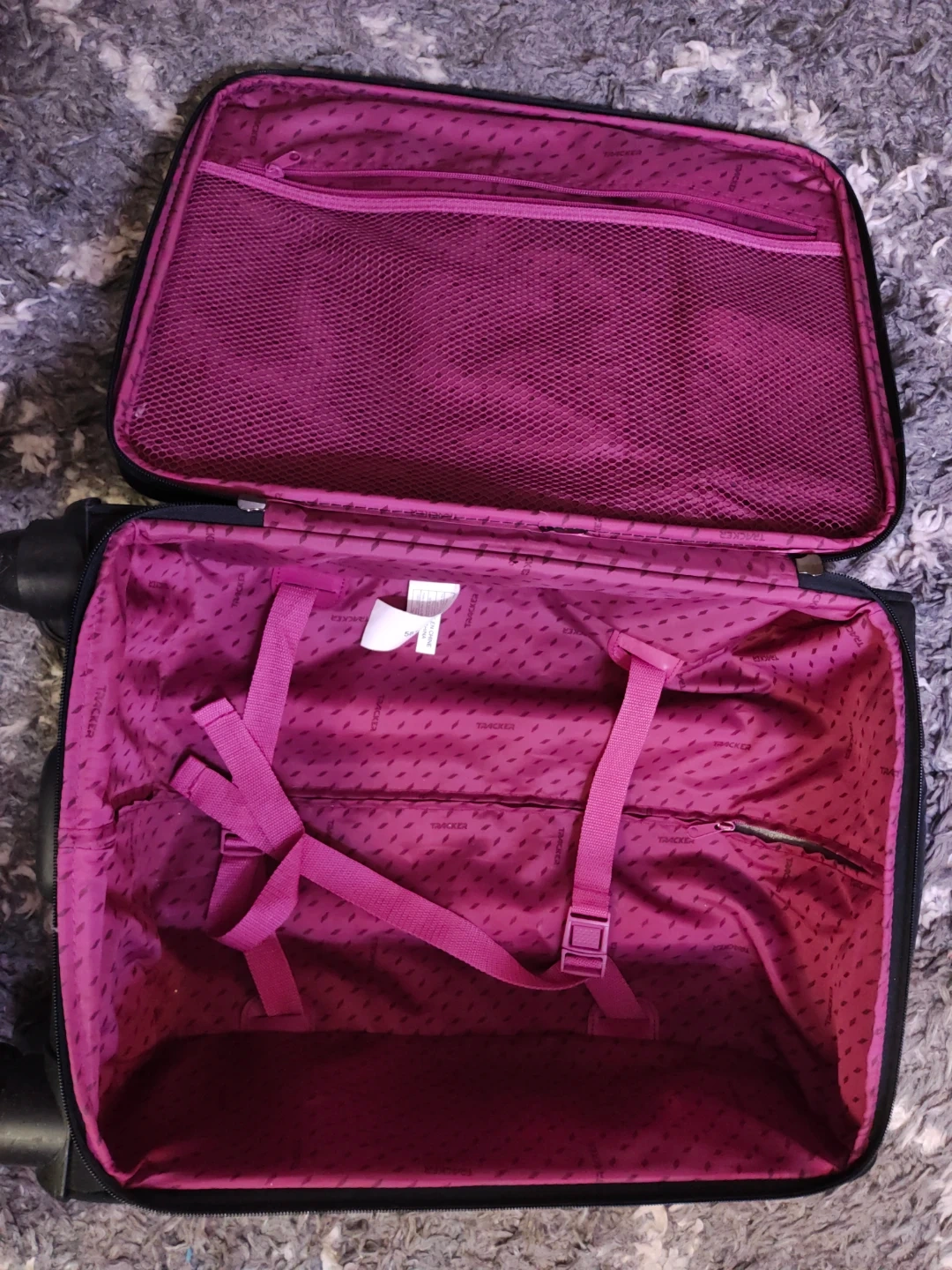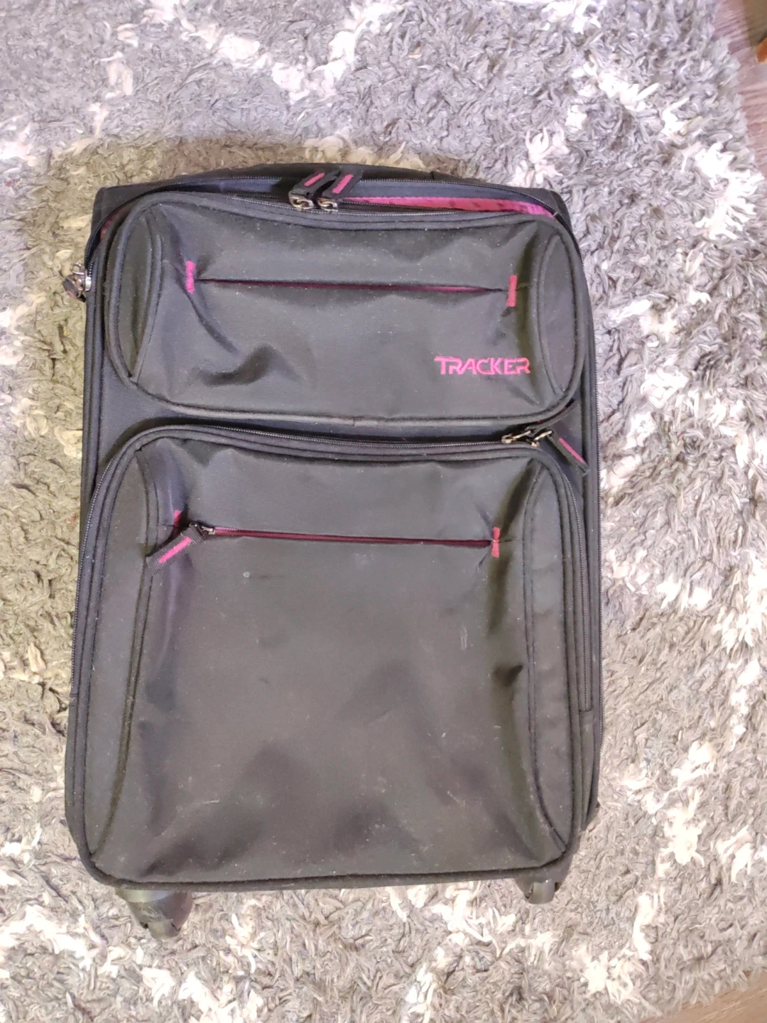 Super cute Tracker carry-on suitcase in black with a hot pink interior. It has wheels and a retractable handle, works perfectly, I just don't have space for it any more. A little dusty but otherwise in excellent condition.