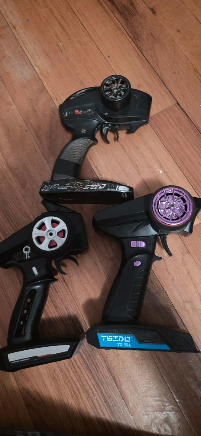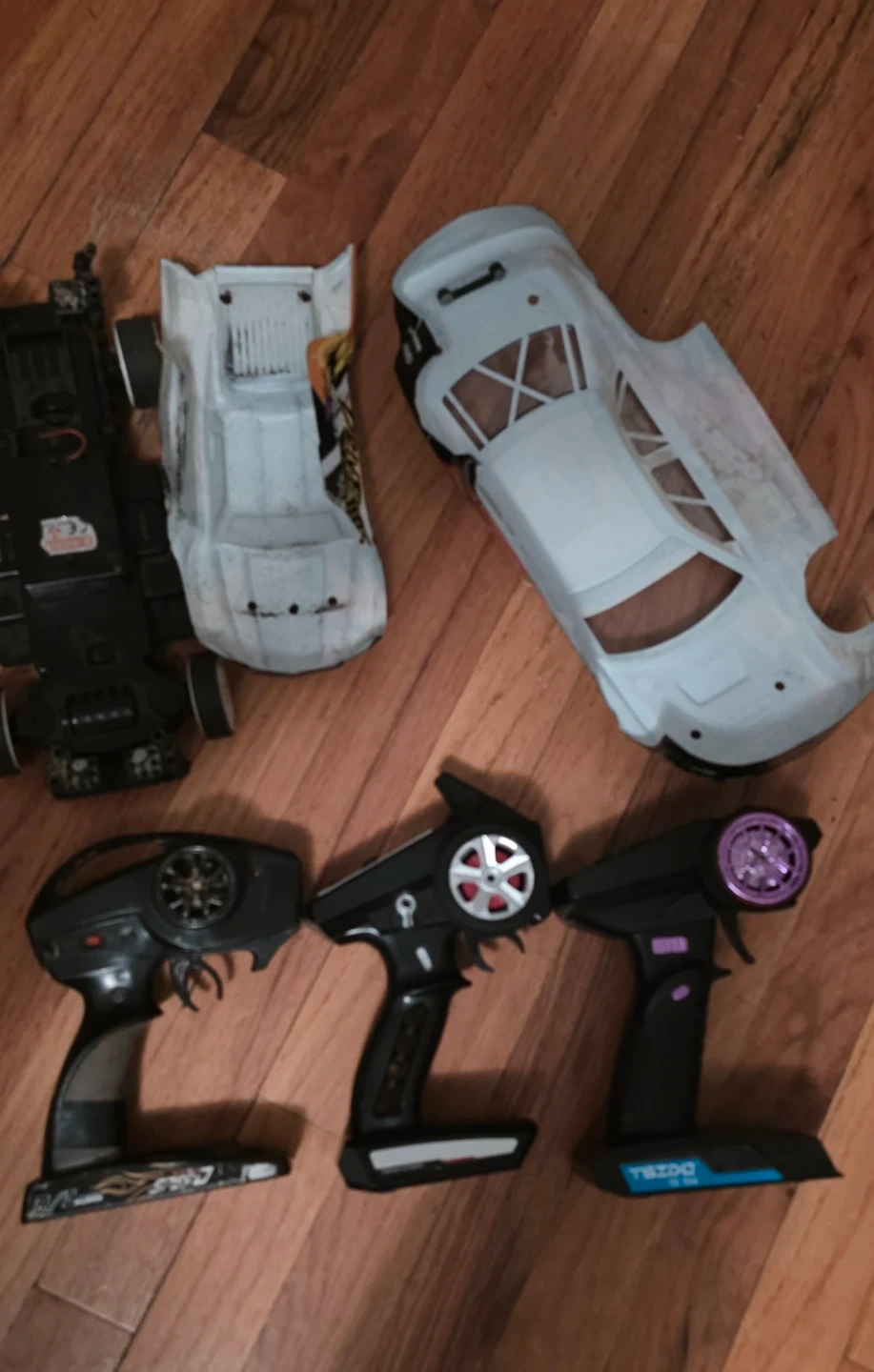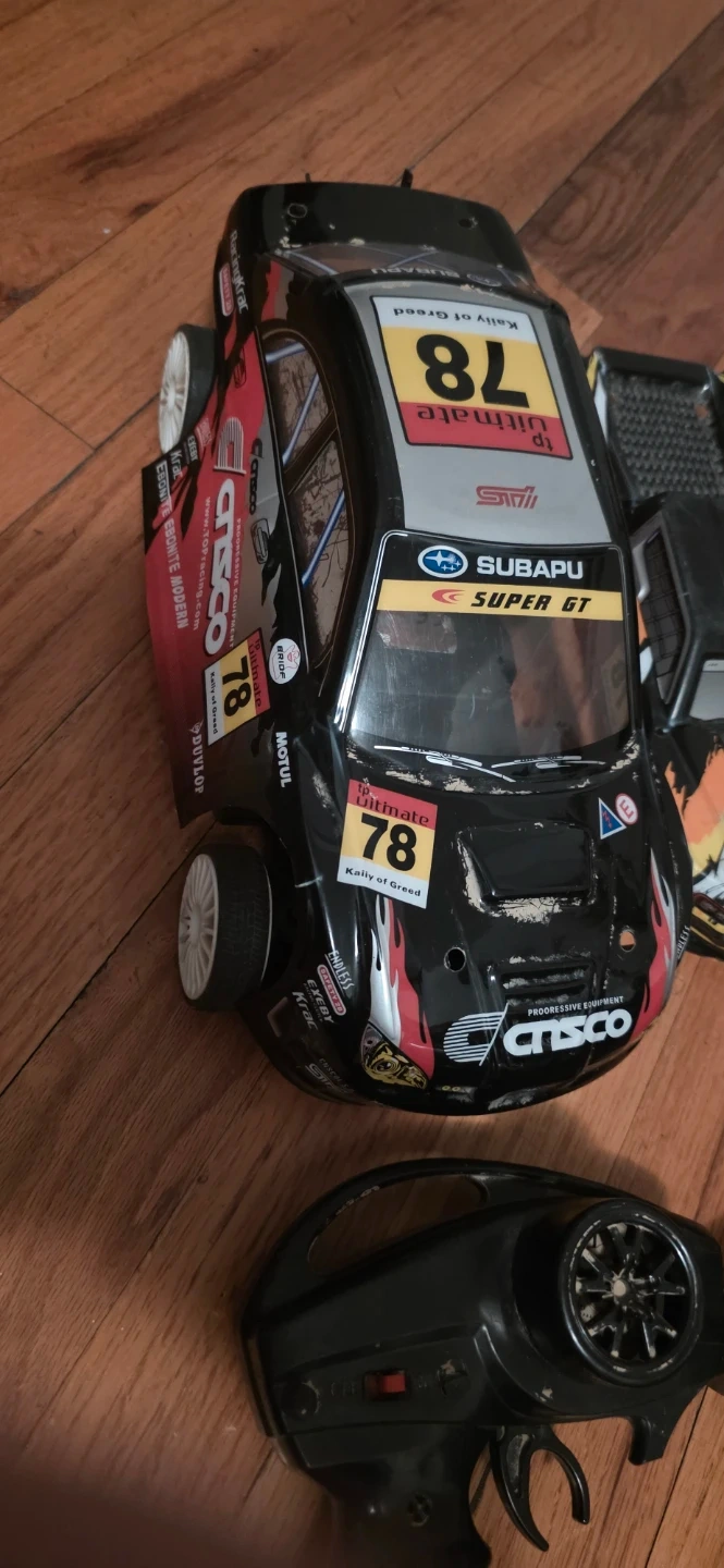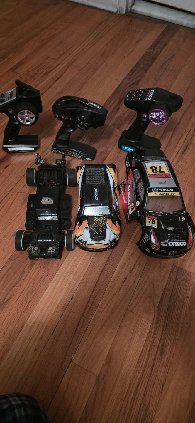 Includes three remote control car controllers and three car bodies. One body is a Subaru Super GT replica selling the lot for cheap for parts only you get everything for a low price