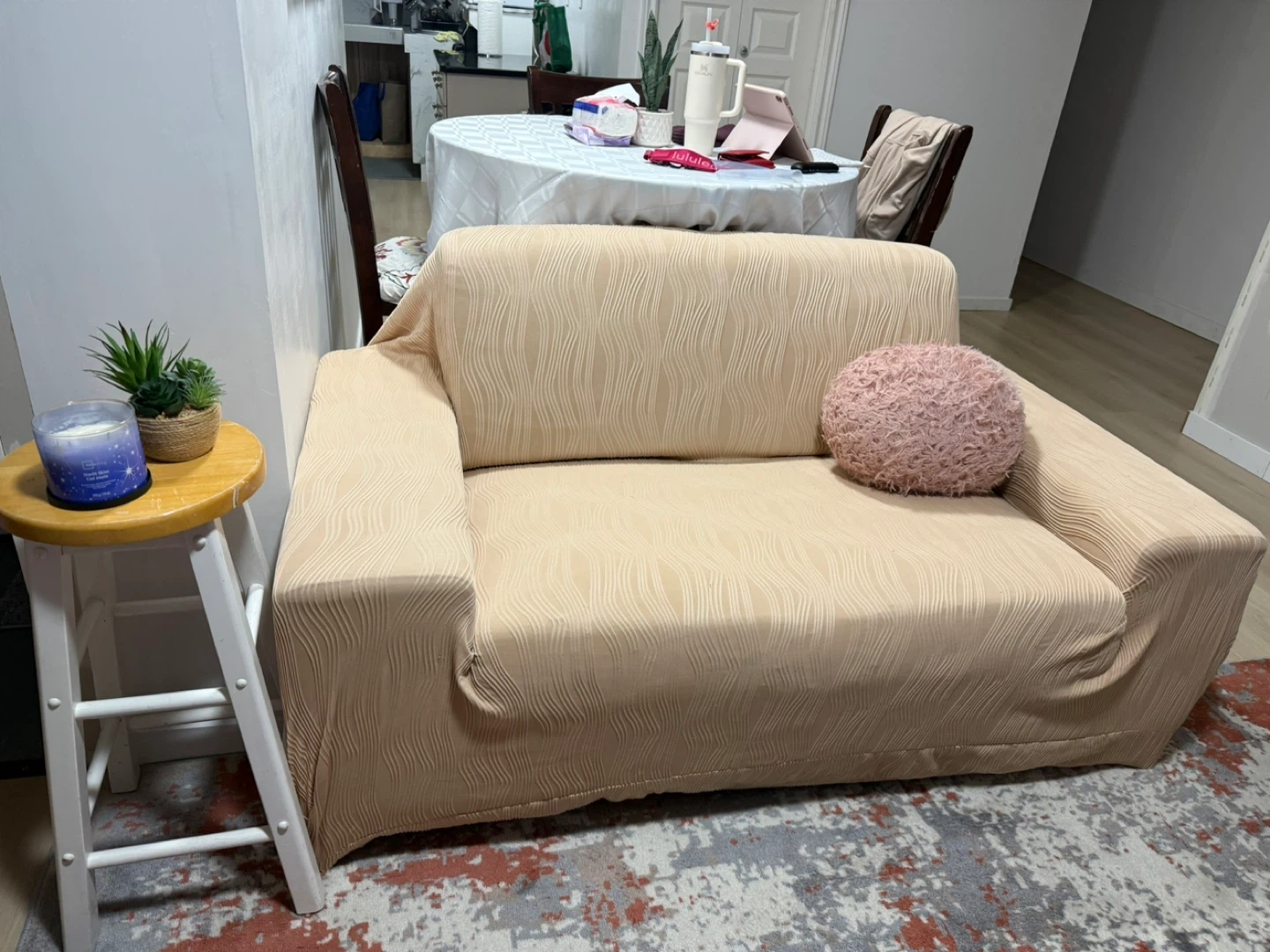 Selling a comfy beige loveseat sofa! It's a great size for smaller spaces and adds a touch of warmth to any room. Perfect for cozying up with a good book or watching your favourite shows