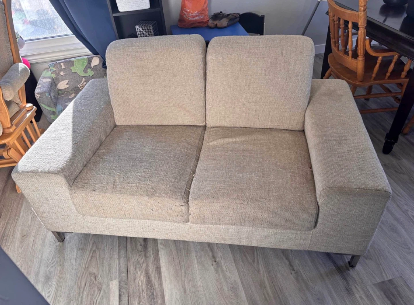Selling a comfy beige loveseat sofa! It's a great size for smaller spaces and adds a touch of warmth to any room. Perfect for cozying up with a good book or watching your favourite shows