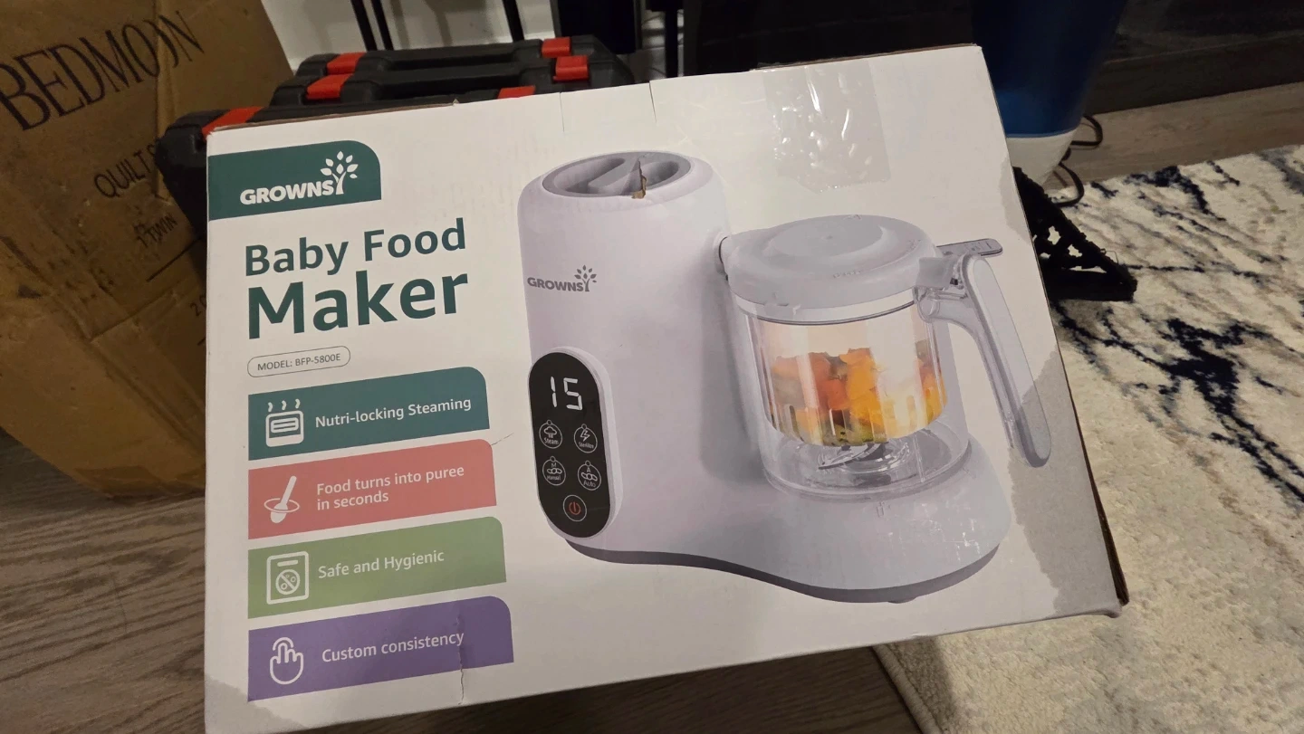 This Grownsy baby food maker features nutri-locking steaming and turns food into puree in seconds. It offers custom consistency and is safe and hygienic. It's great for preparing homemade baby food quickly! Brand New