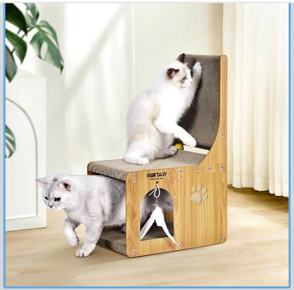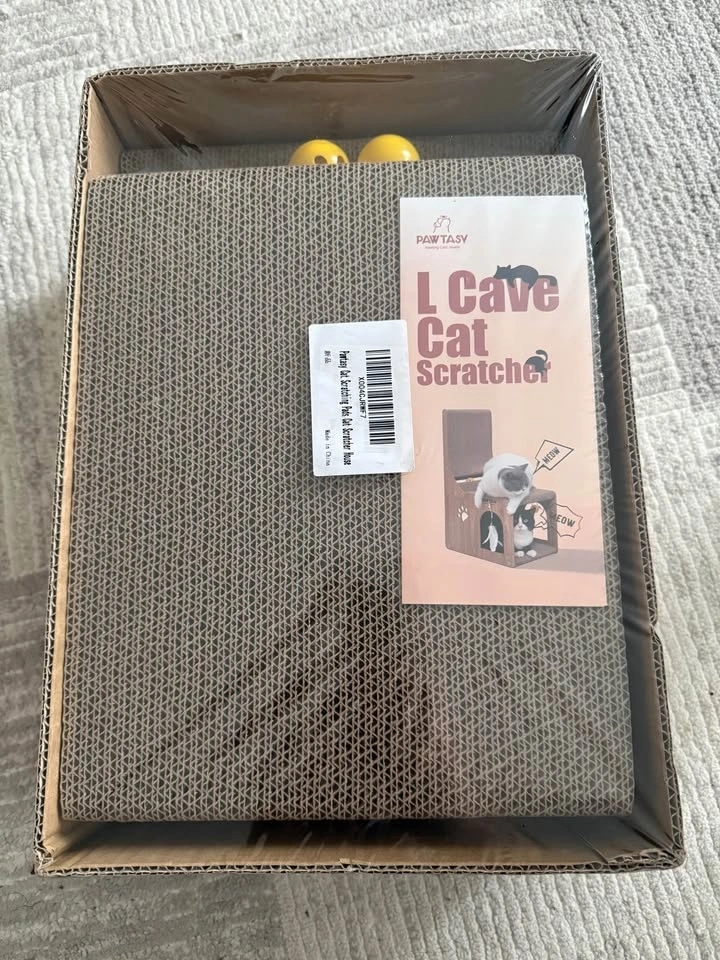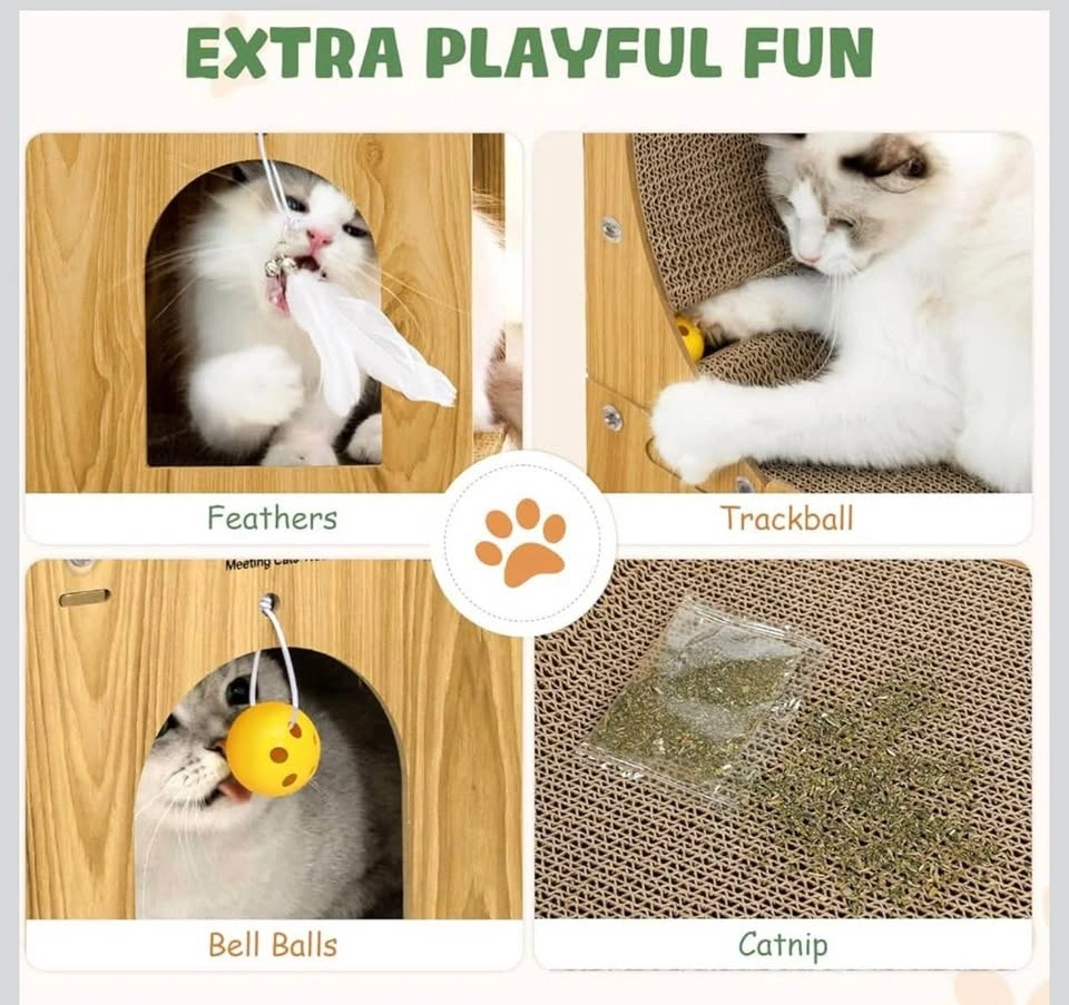 Brand new 2-in-1 cat scratcher and hideaway. Cats can scratch vertically and horizontally, and hide inside. Includes trackball, feather toys, and jingle bells for extra fun. Eco-friendly, non-toxic cardboard with easy tool-free setup. Dimensions: 27.9L × 38.1W × 63.5H cm.
