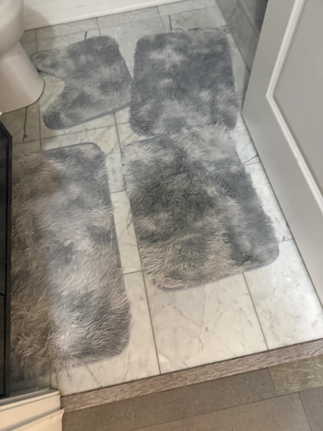 Set of three gray faux fur bath mats. Includes one contoured mat for around the toilet and two rectangular mats. Plush and soft for comfortable stepping.