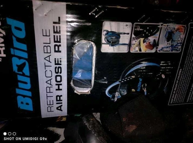 Keep your workspace tidy with this BluBird Retractable Air Hose Reel. It features a heavy-duty steel construction, a fully retractable hose, and a ratcheting mechanism with an adjustable hose stopper. Ready to make managing air hoses a breeze! Cash accepted.