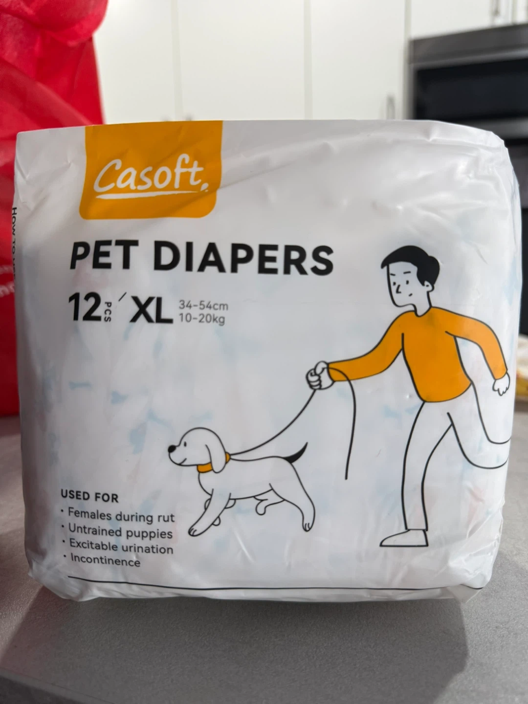 Pet Diapers, size XL. These are used for females during rut, untrained puppies, excitable urination, and incontinence. The package contains 12 diapers. Waist size 34-54cm, suitable for pets weighing 10-20kg.