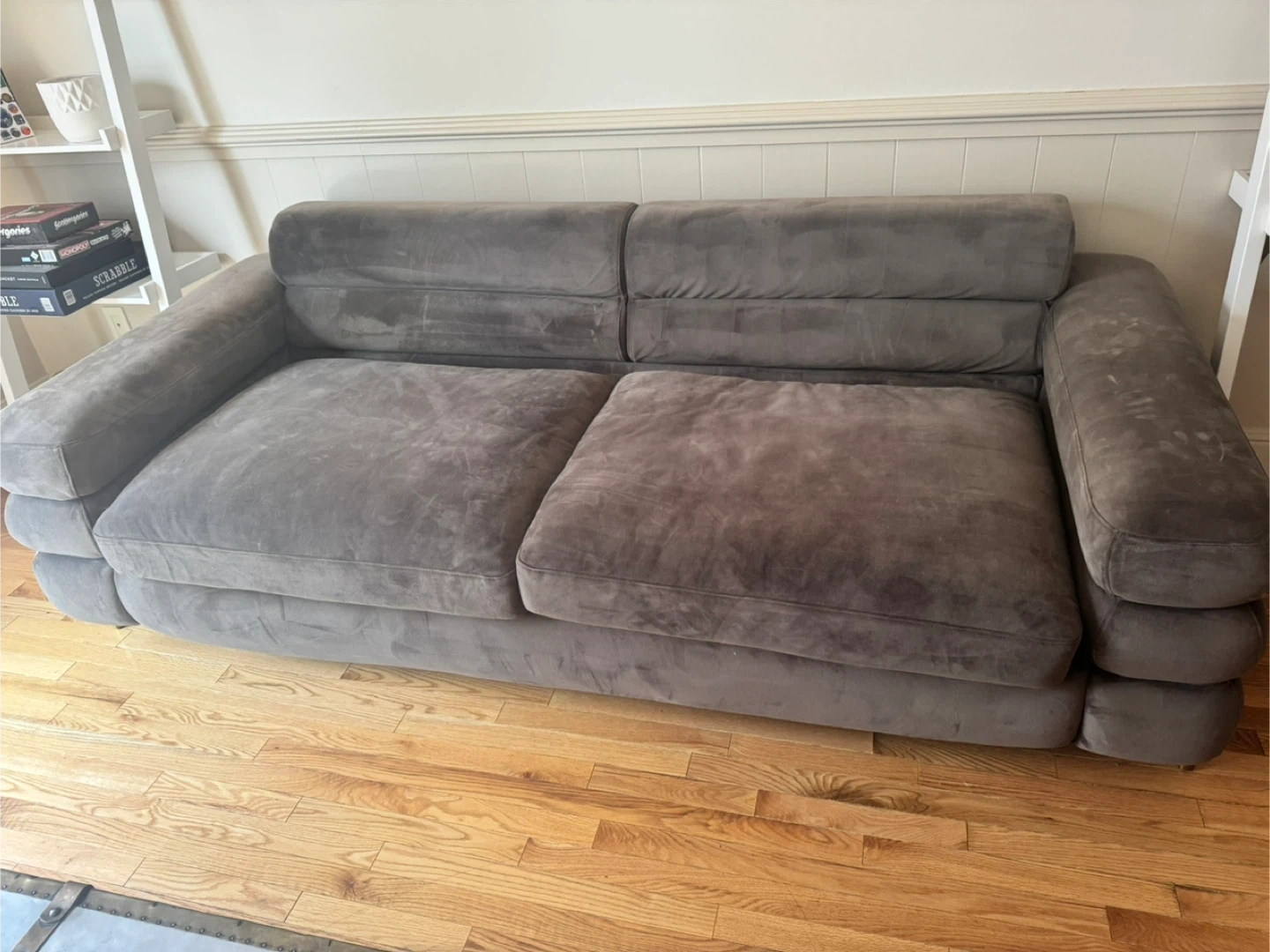 Grey sofa. deep seating. recently just got it clean and scotch guarded unfortunately it made the seating and arm area a bit stiff (the material). but the company said it’ll soften up once people start to sit on it again. paid almost $1700. Asking $650