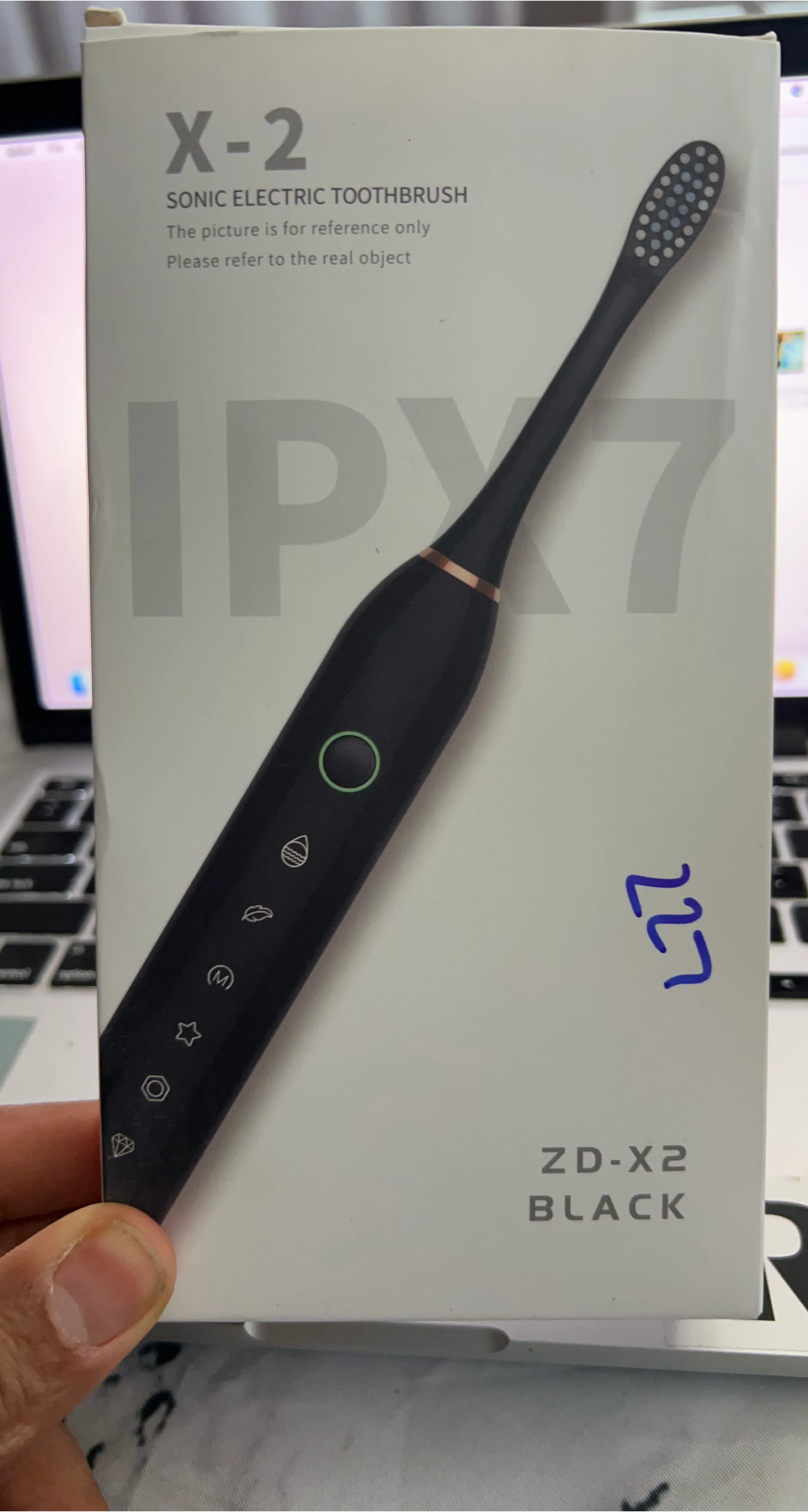 This is a black ZD-X2 sonic electric toothbrush. It's IPX7 waterproof rated. Features multiple modes indicated by icons.