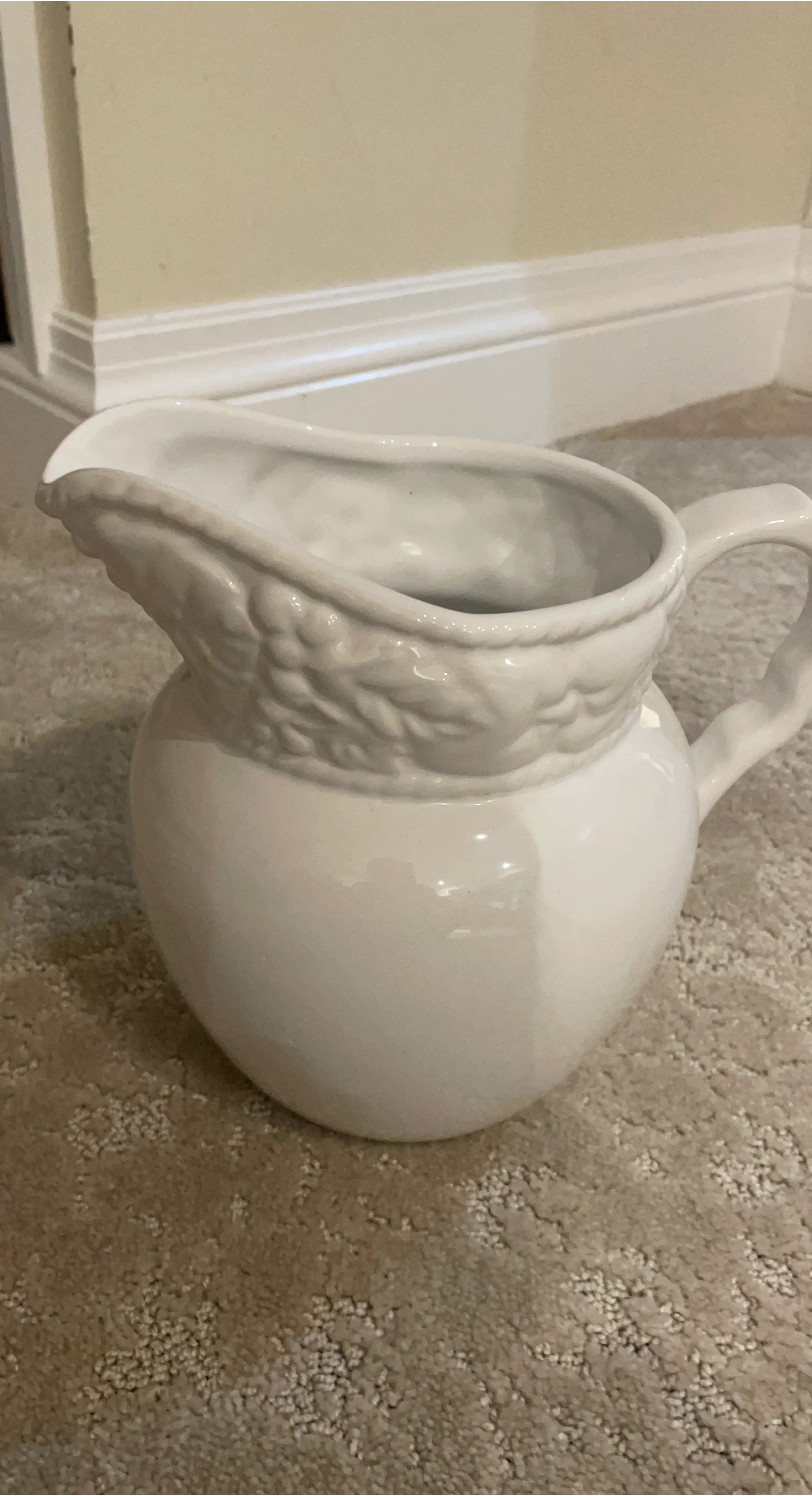 This is a classic white ceramic pitcher. It features an embossed leaf-like design around the top rim. It's a lovely piece for serving beverages or as a decorative accent.