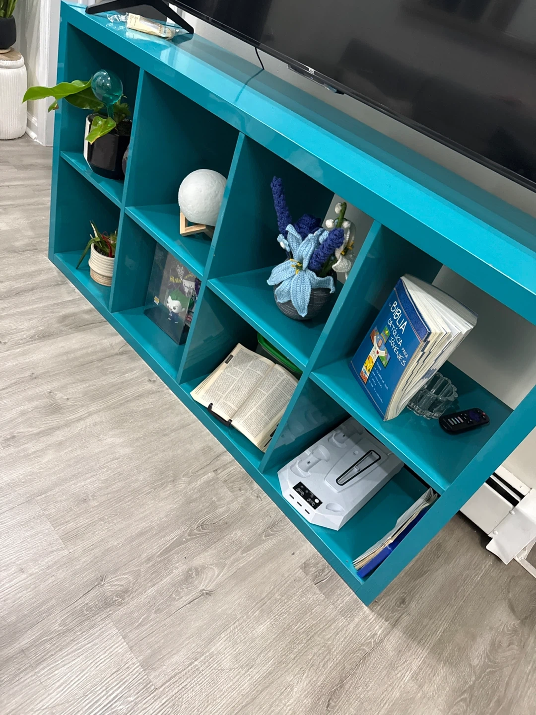 This teal cube storage unit offers multiple open compartments for display or storage. Its vibrant color makes a statement in any room. Perfect for organizing books, plants, or decorative items!
