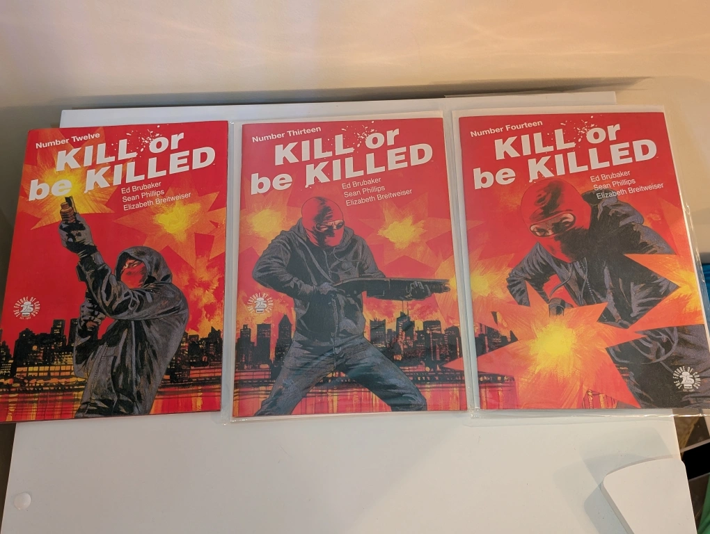 Three graphic novels: Kill or Be Killed #12, #13, and #14. Image Comics. By Ed Brubaker, Sean Phillips, and Elizabeth Breitweiser.