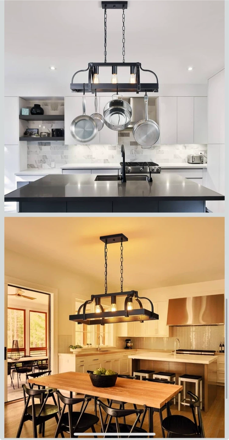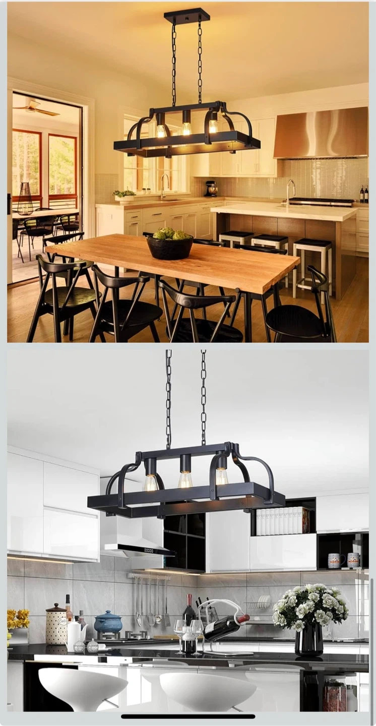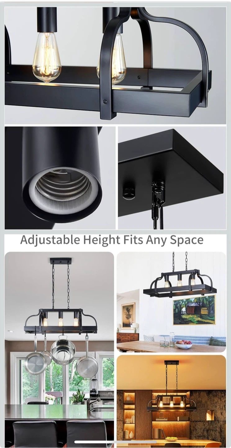 This black pendant light fixture features a rustic farmhouse design with three E26 base sockets. It's crafted from metal with a wood-look accent and offers adjustable height for easy installation. Perfect for your kitchen island or dining room!