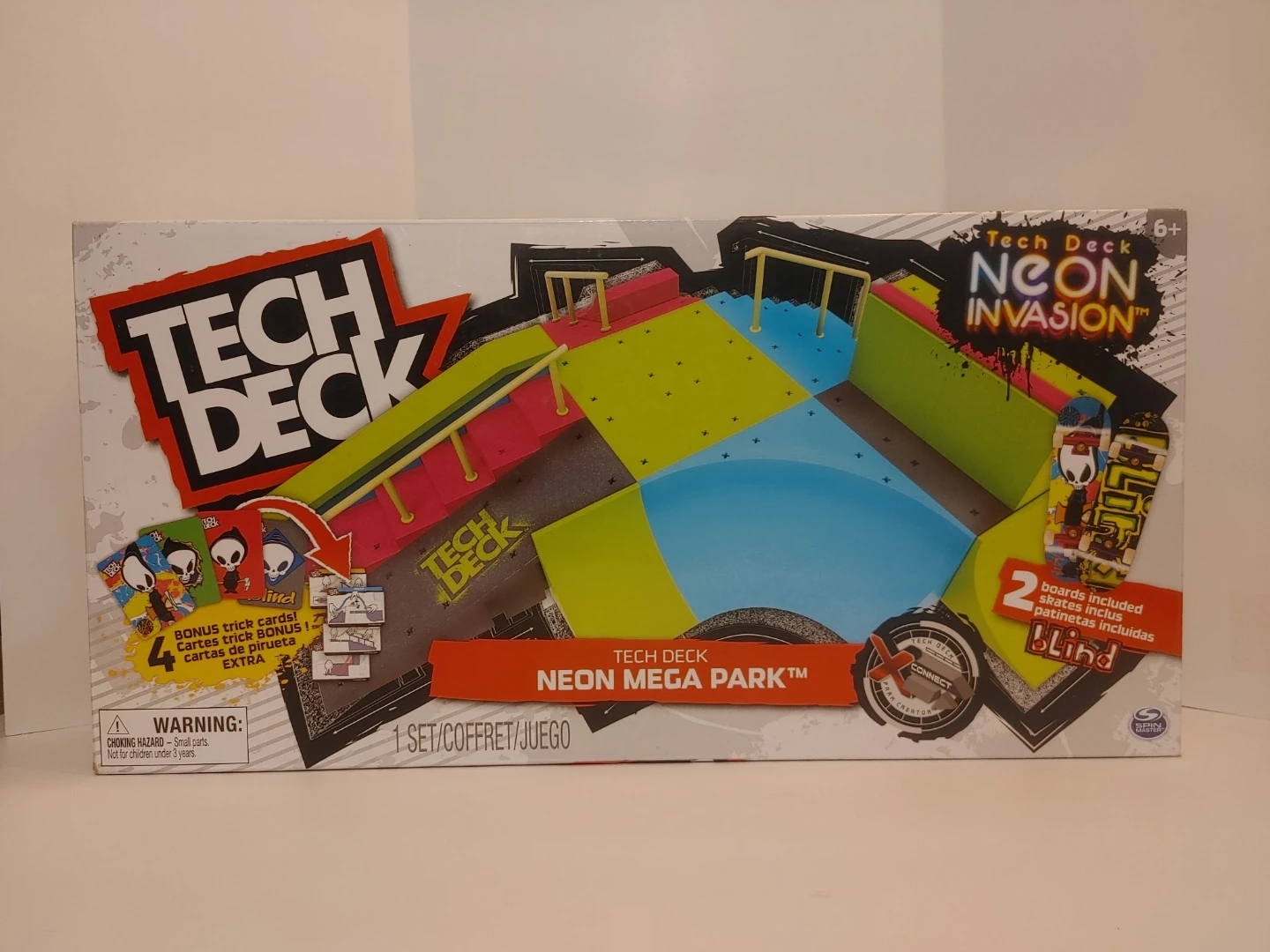 This is a Tech Deck Neon Mega Park playset. It includes 2 boards and 4 trick cards. Recommended for ages 6 and up.