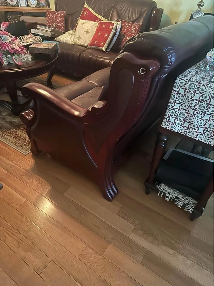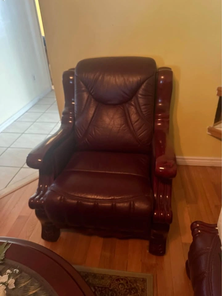 Classic leather sofa and armchair set. Both pieces have rich burgundy leather and ornate wooden frames. Sofa is a two-seater. Armchair has matching design. Good for living room or den. Selling single and 3 seat couch as well