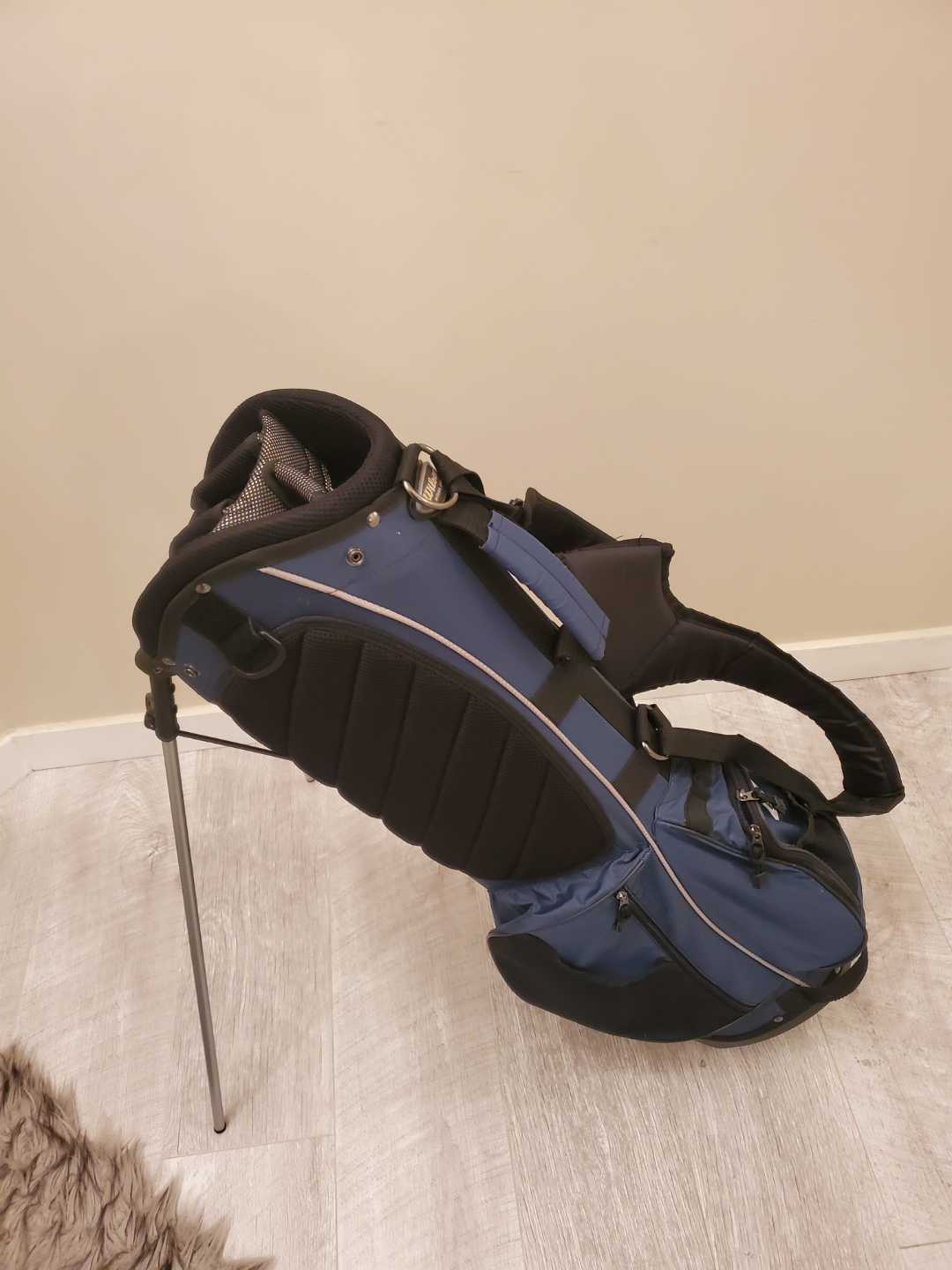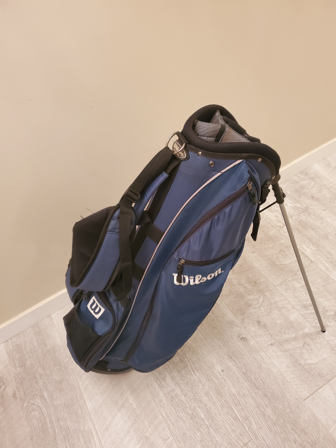 Pre-owned Wilson golf stand bag. Blue and black colour scheme. Features multiple pockets and a stand. Great for carrying your clubs.