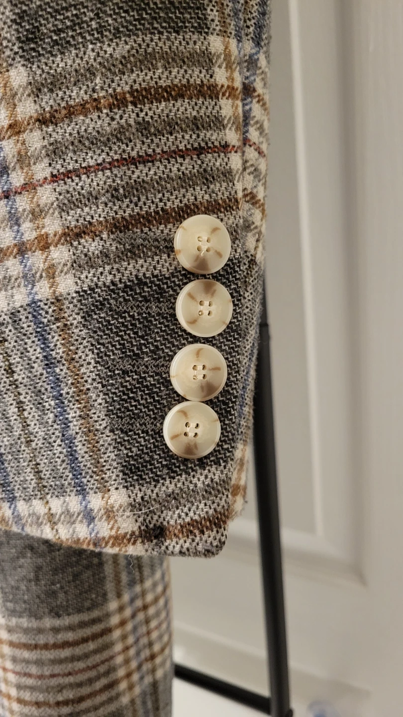 This is a 5cm blazer with a classic plaid pattern in Korean style. It features a double-breasted closure and a satin-lined interior. The size is S, with measurements 170/88A.