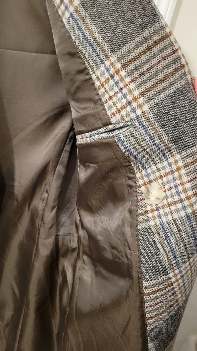 This is a 5cm blazer with a classic plaid pattern in Korean style. It features a double-breasted closure and a satin-lined interior. The size is S, with measurements 170/88A.
