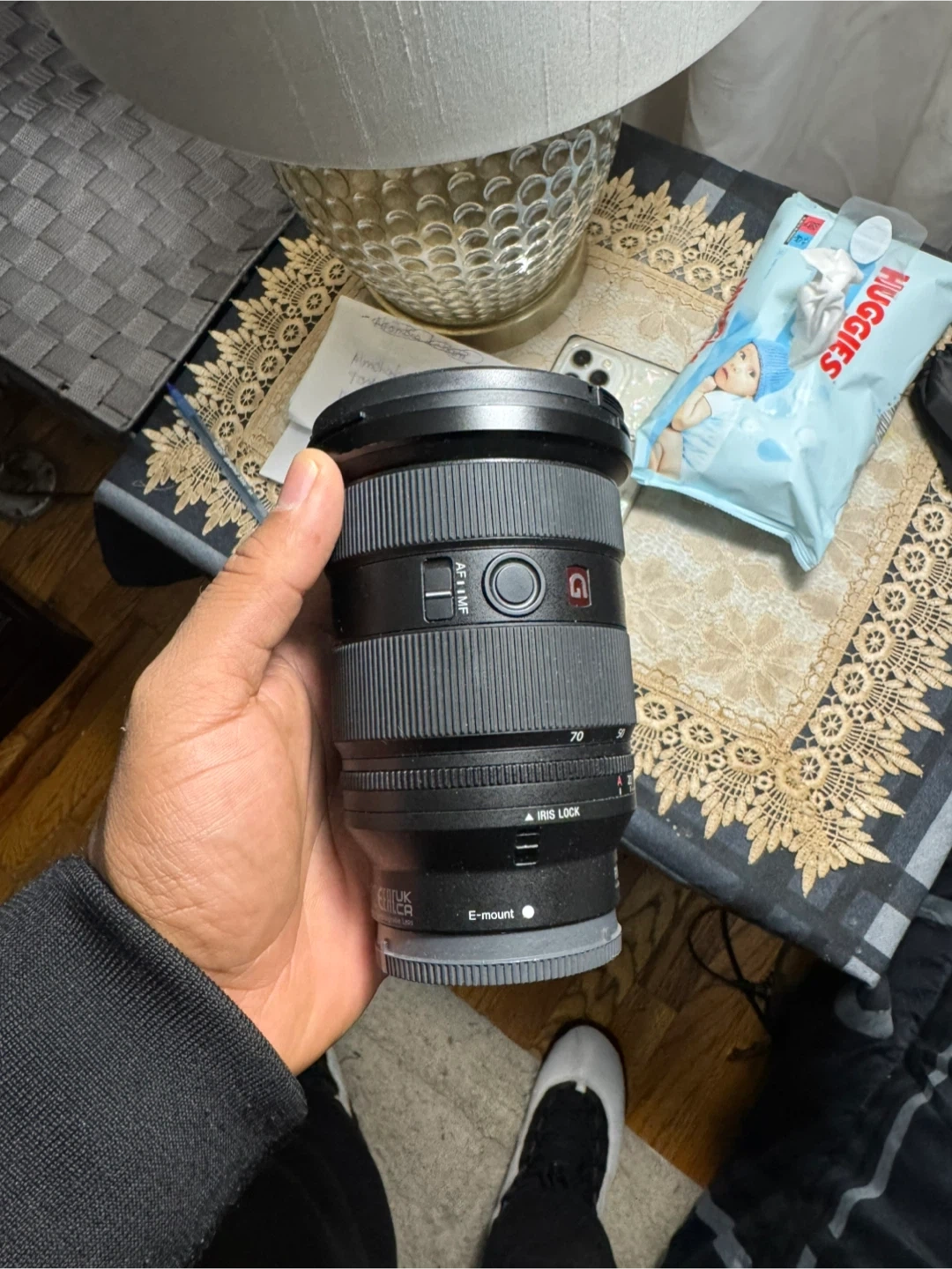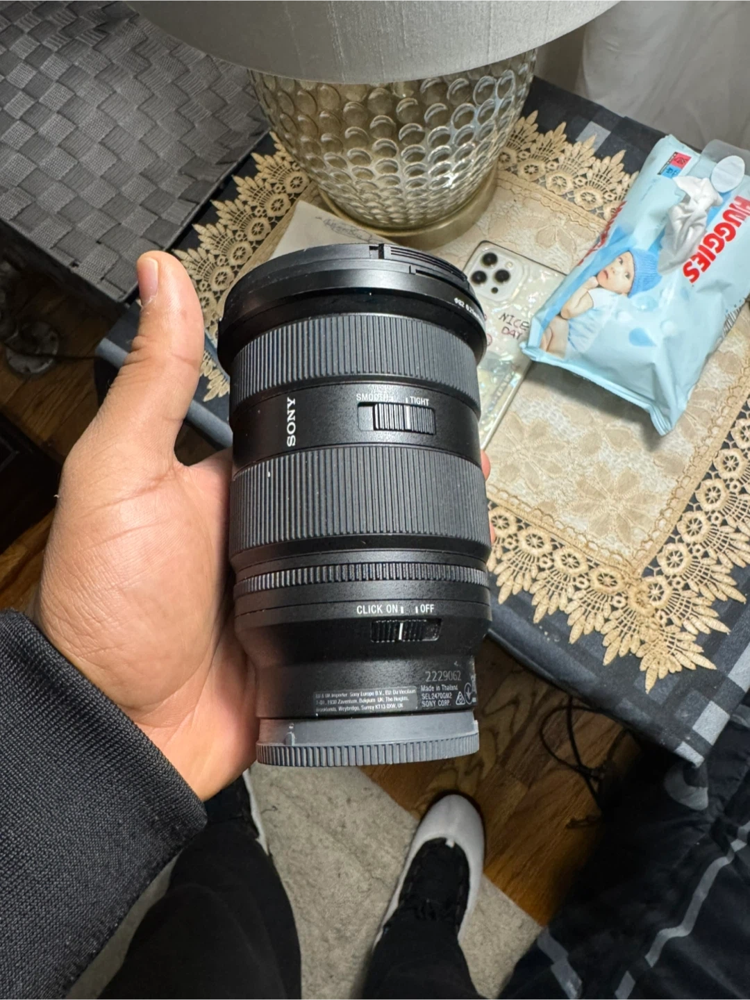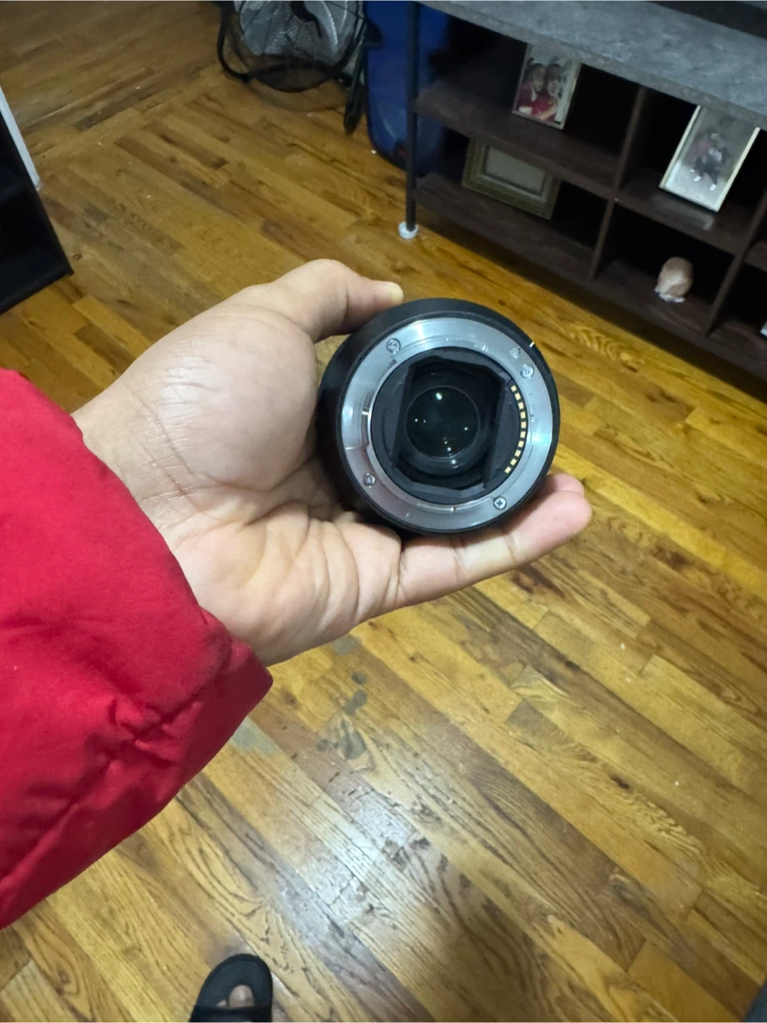 This is a Sony camera lens. It's black and has various controls for focus and aperture. Perfect for capturing high-quality photos and videos.
