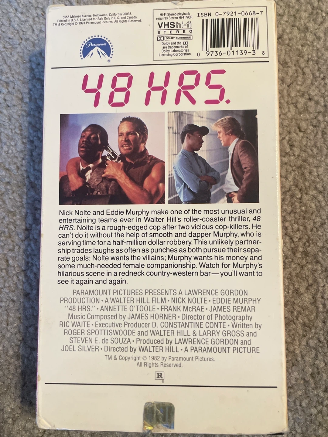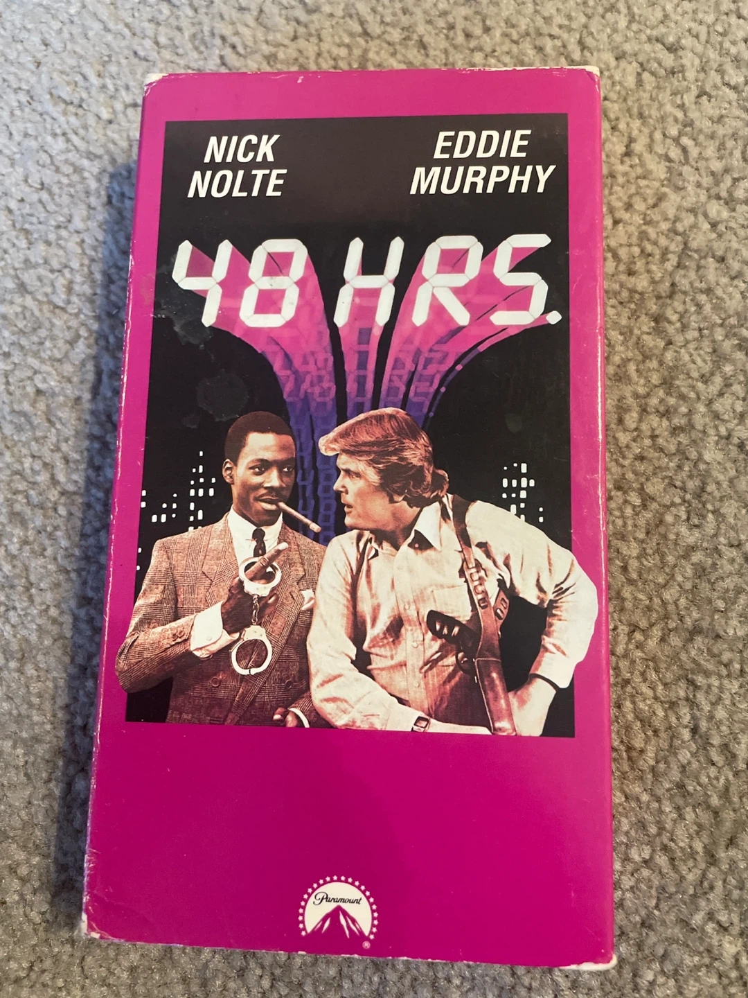 This is the VHS copy of the classic action-comedy, 48 Hrs., starring Nick Nolte and Eddie Murphy. It's a fast-paced thriller with plenty of laughs and action. This copy is from Paramount Pictures and includes the original case.