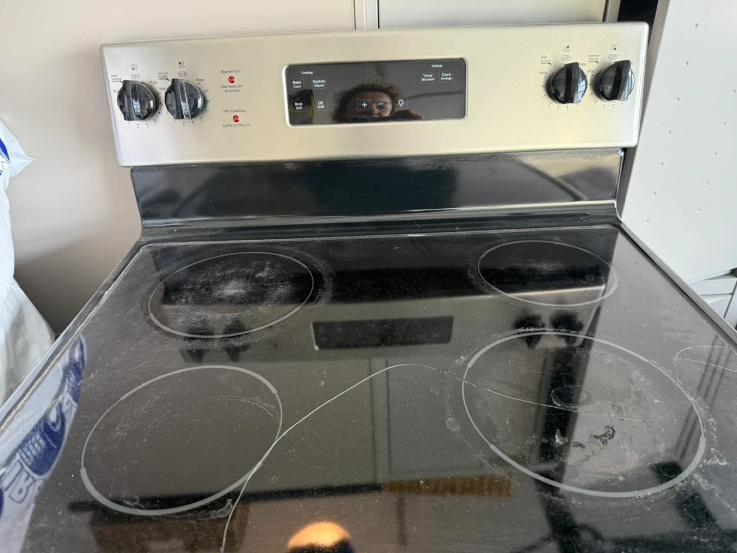 This is a GE electric stove with a coil top. It has a stainless steel finish and a glass cooktop. The oven below is also included. There is a small crack on the glass top as shown on the picture.