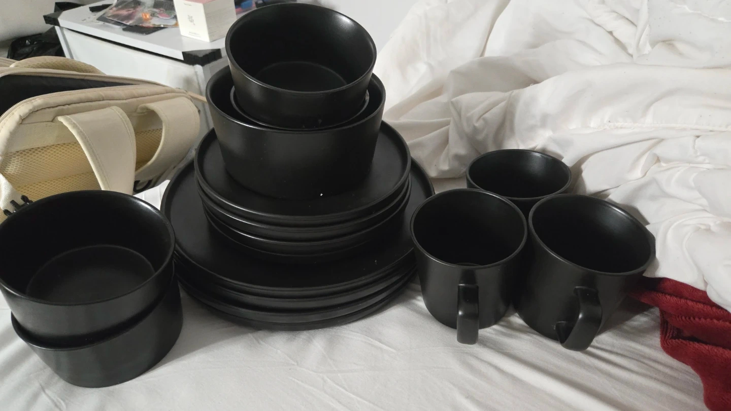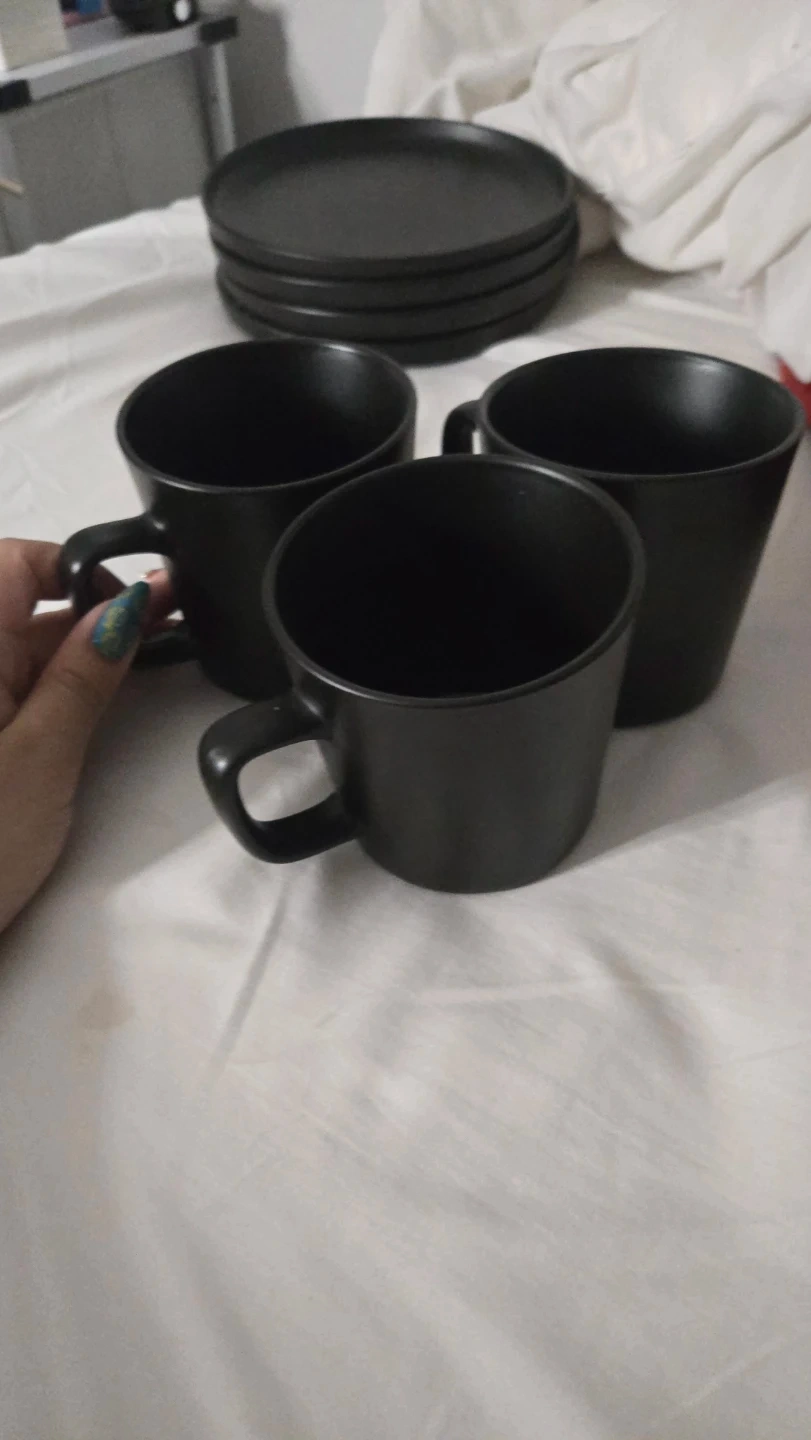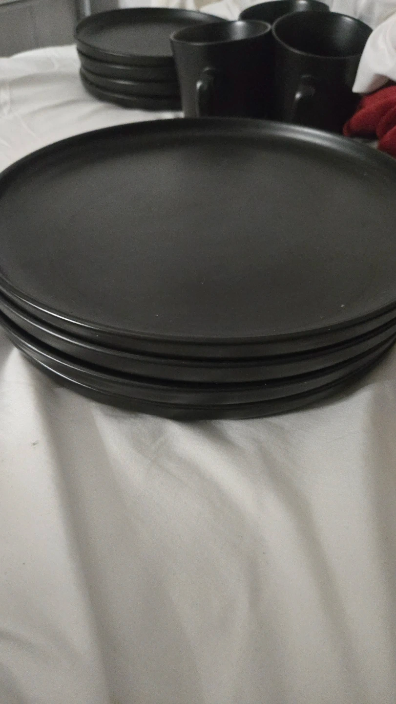 Selling a set of black dinnerware. Includes plates, bowls, and mugs. Great for everyday use or special occasions! See pieces are messing.