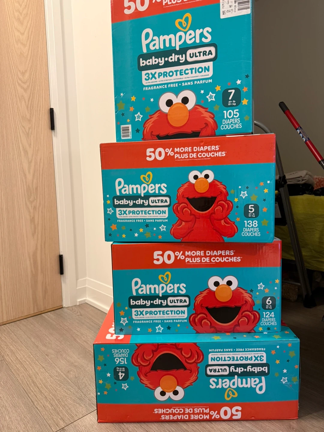 Bulk lot of Pampers Baby-Dry Ultra diapers featuring 3X Protection. Includes sizes 7 (105 ct), 5 (138 ct), 6 (124 ct), and 4 (156 ct). All are fragrance-free.