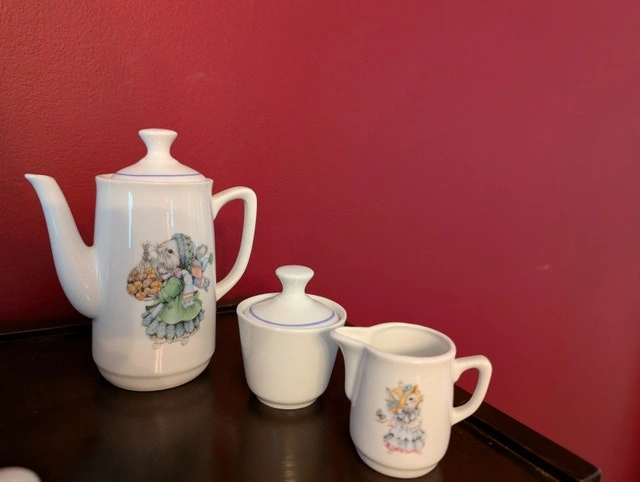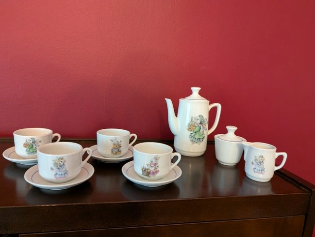 Ceramic tea party set with a cute bunny design. Includes one teapot and lid (approx. 6 in tall), four cups and saucers, and a creamer and sugar bowl with lids. Perfect for a tea party with the kids in your life, at Easter or any time. Used - like new. Cash accepted.