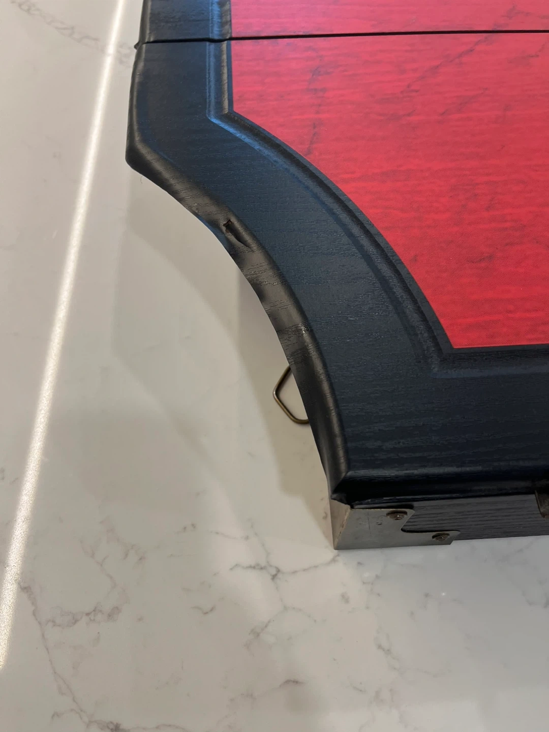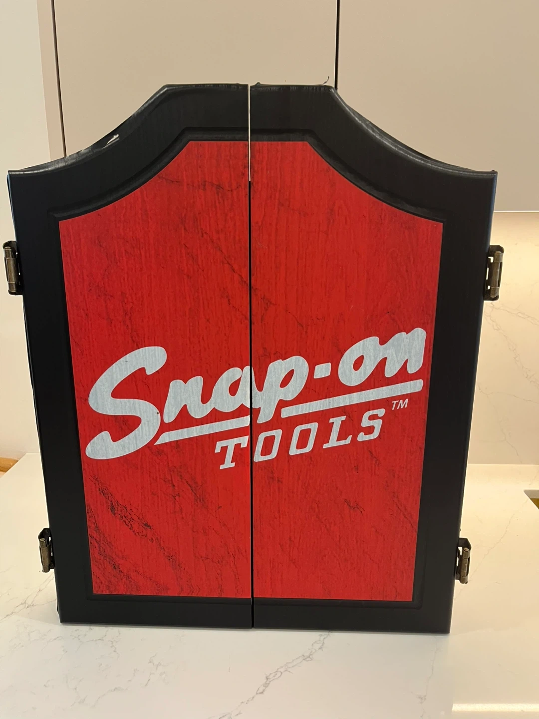 The Snap-On Tools Deluxe Bristle Dartboard Cabinet Set features a sleek design with a red and black logo, adding a touch of style to any game room or bar. Only been used a handful of times and in great shape. The dartboard cabinet shows some pealing at the top, but just cosmetic.