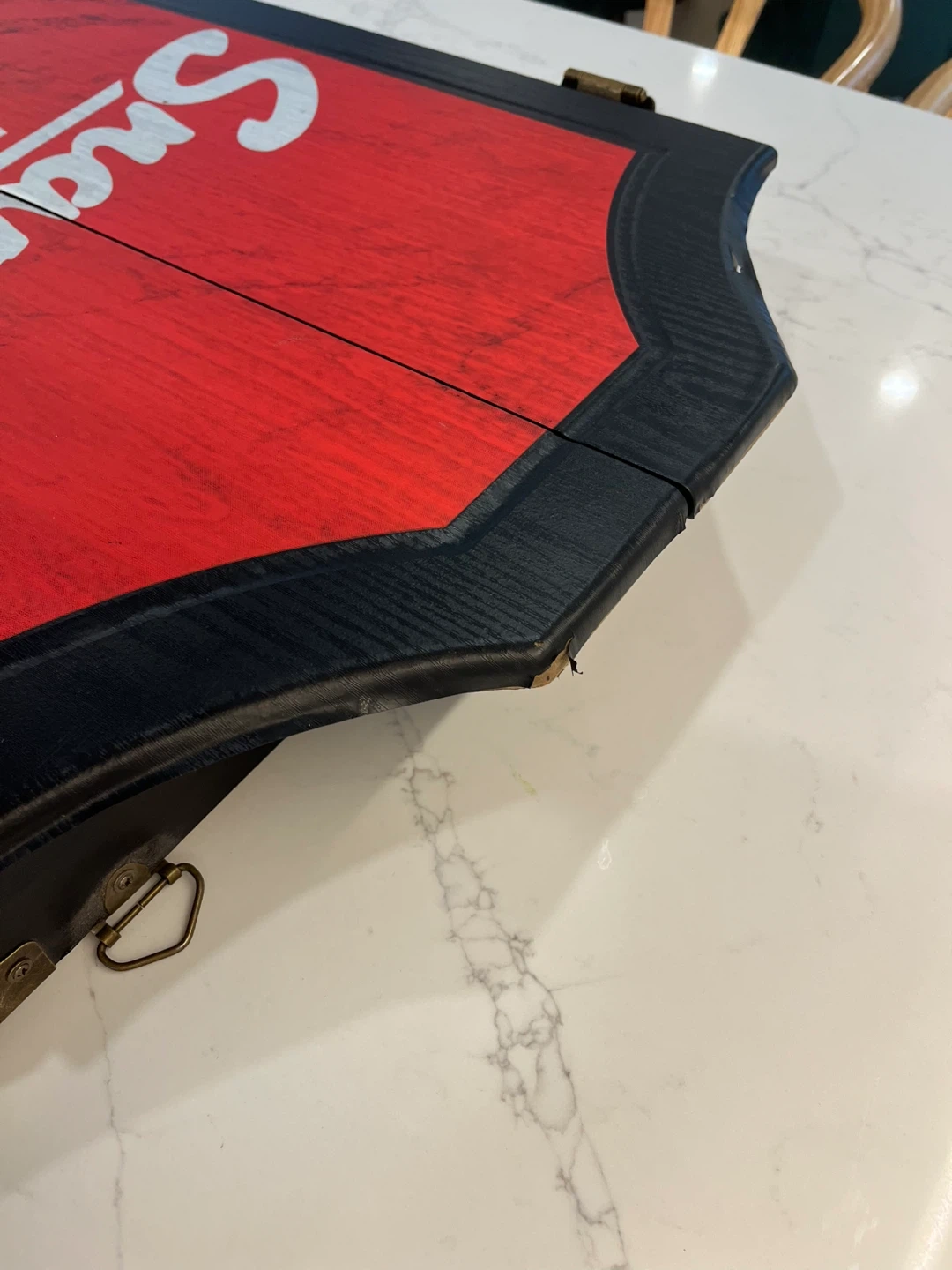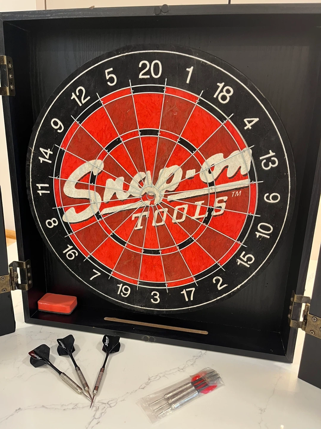 The Snap-On Tools Deluxe Bristle Dartboard Cabinet Set features a sleek design with a red and black logo, adding a touch of style to any game room or bar. Only been used a handful of times and in great shape. The dartboard cabinet shows some pealing at the top, but just cosmetic.