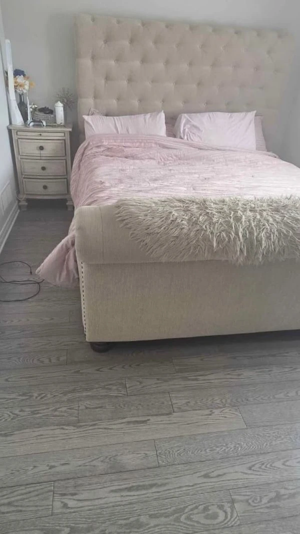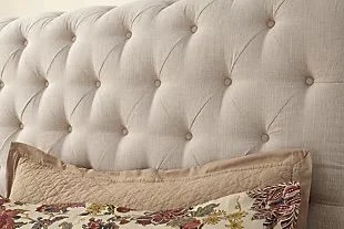 Tufted upholstered bed frame with a beige linen-look fabric. This queen-size bed features a button-tufted headboard and a sturdy frame. It's a lovely addition to any bedroom!