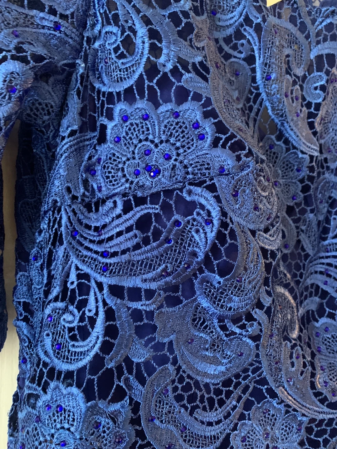Elegant Nina Couture dress featuring intricate blue lace detailing with subtle bead embellishments. The dress has a flowing skirt and 3/4 length lace sleeves. It's medium size. It's perfect for formal occasions or evening events!
