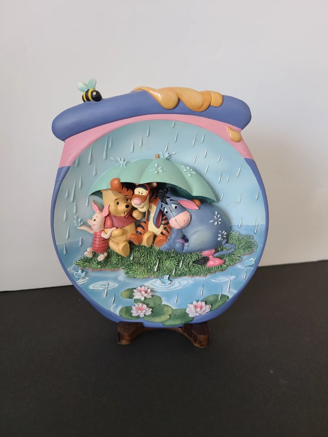 This is the first issue in the Bradford Exchange's "Pooh's Honeypot Adventures" plate collection. It features Winnie the Pooh, Tigger, Piglet, and Eeyore under an umbrella during a rain shower. This limited edition closed forever no later than October 31, 1999. It's a lovely piece for any Disney or Winnie the Pooh collector!