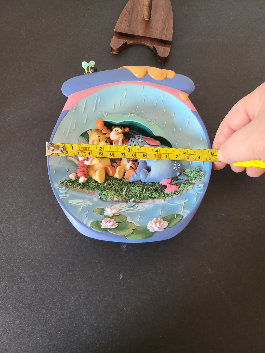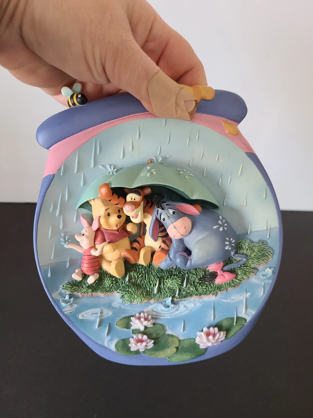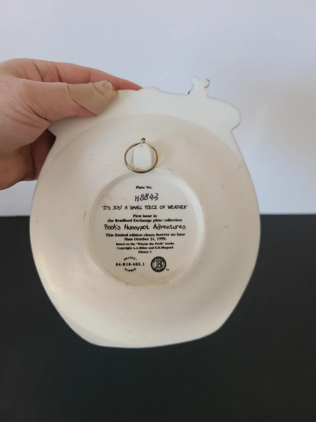 This is the first issue in the Bradford Exchange's "Pooh's Honeypot Adventures" plate collection. It features Winnie the Pooh, Tigger, Piglet, and Eeyore under an umbrella during a rain shower. This limited edition closed forever no later than October 31, 1999. It's a lovely piece for any Disney or Winnie the Pooh collector!
