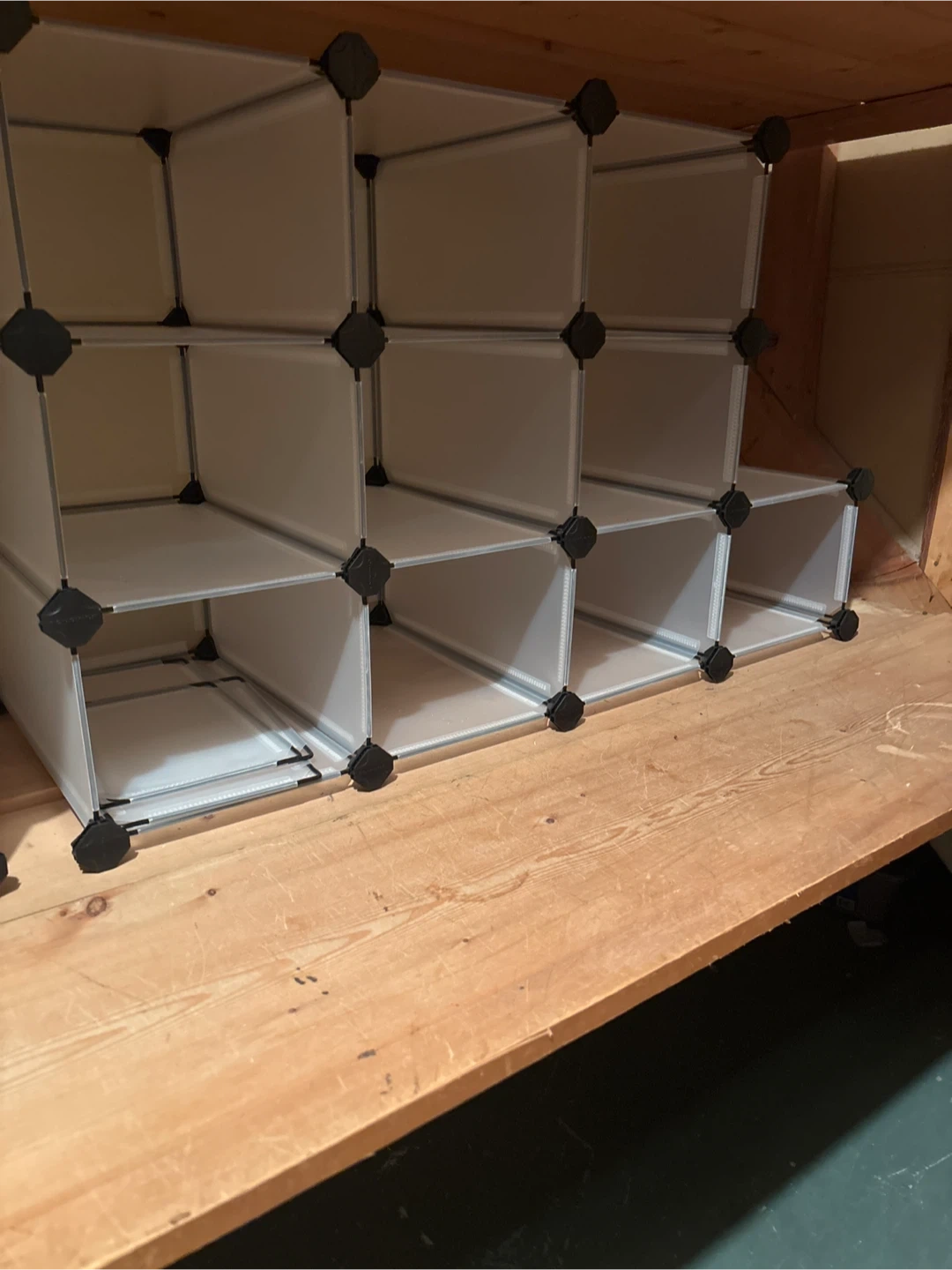 This is a modular cube storage unit with a white finish. It's made of plastic panels and connectors. It comes with multiple cubes that can be arranged in various configurations. Great for organizing small items!